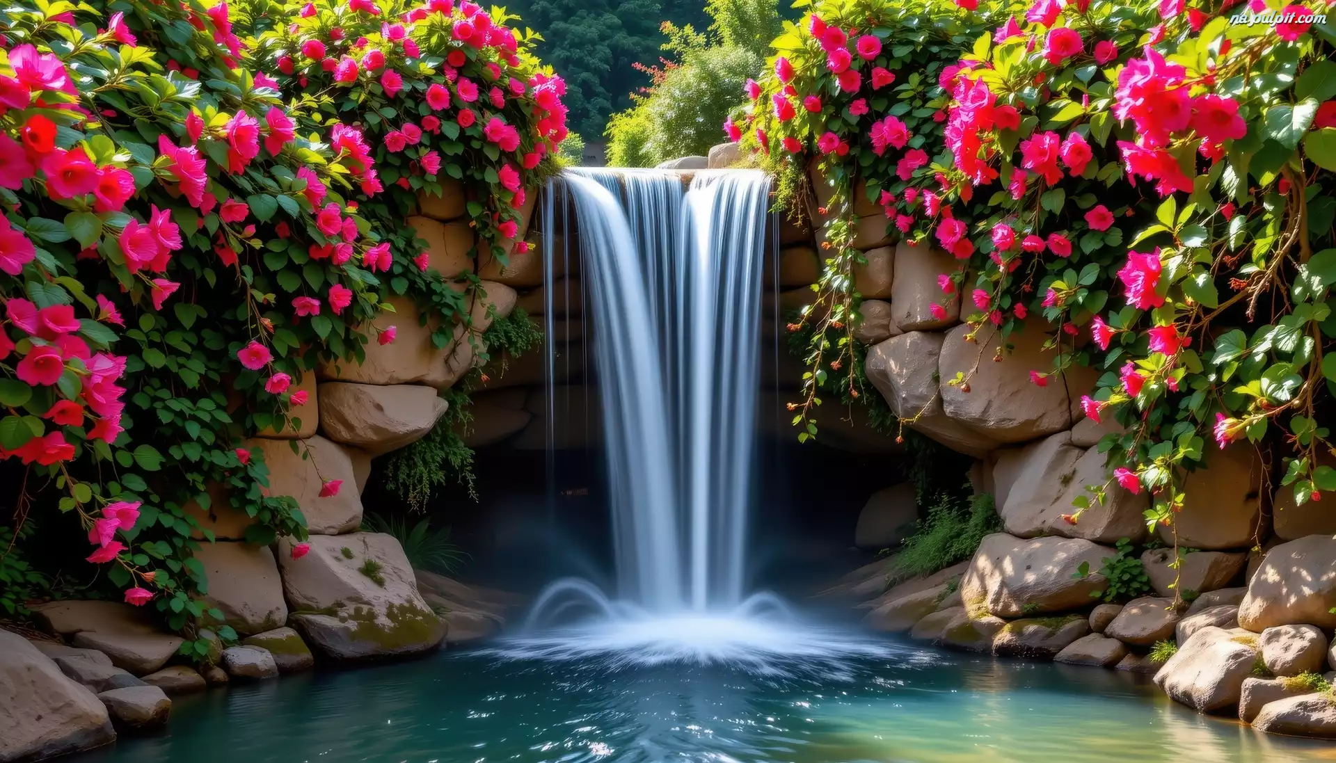 Różowe, Ogród, Wodospad, Skały, Mały, Kwiaty Na Pulpit