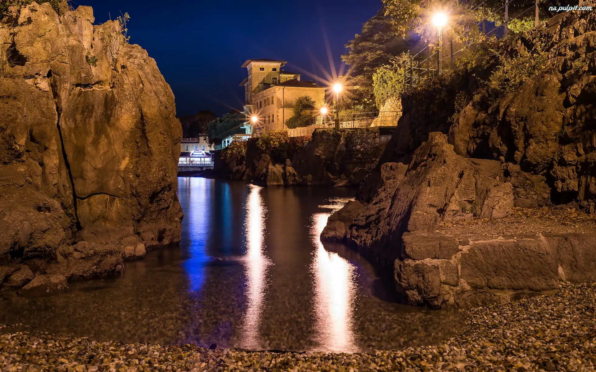 Chorwacja, Skały, Riwiera Opatija, Latarnie, Domy, Noc, Lovran