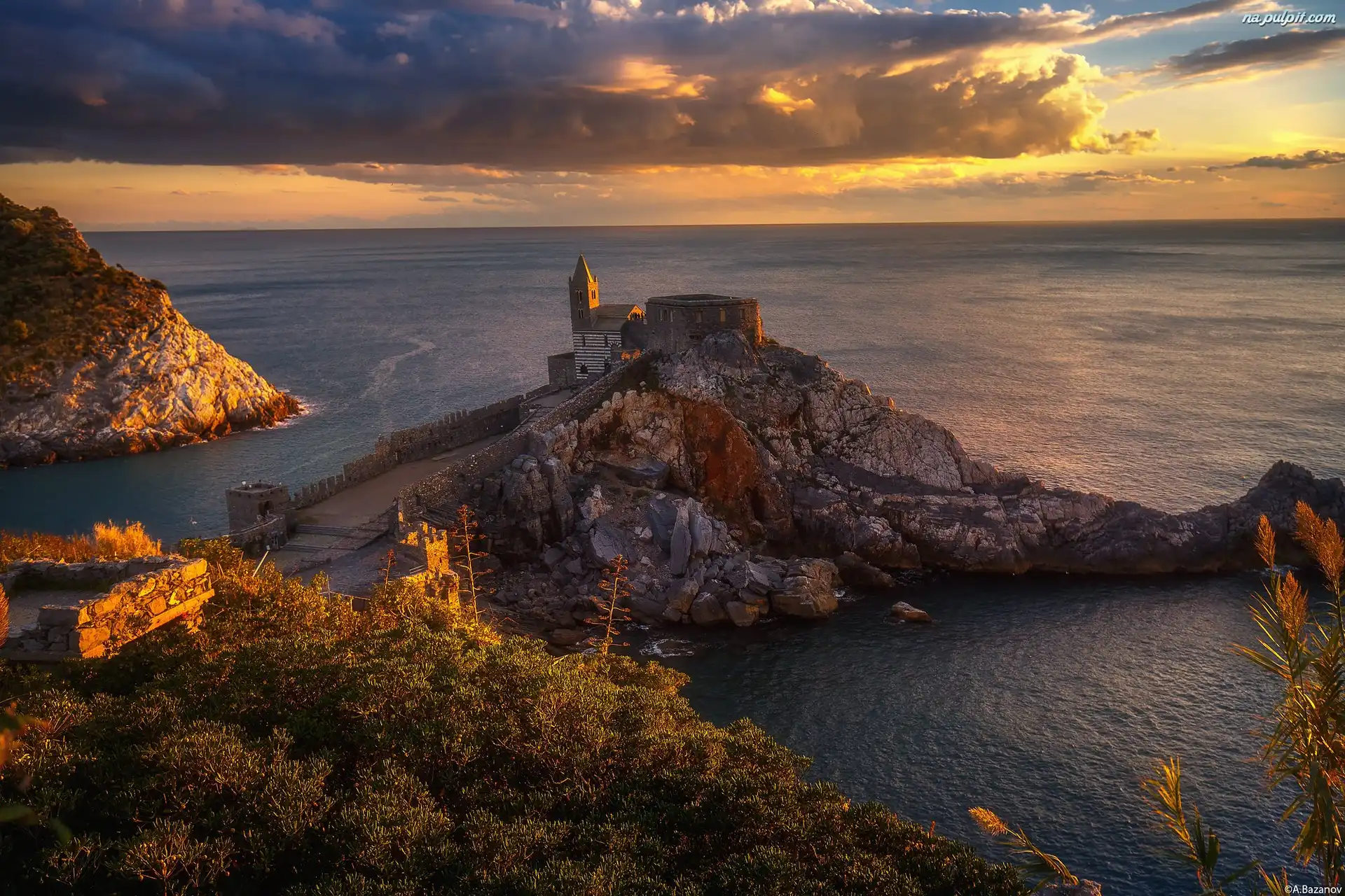 Skały, Region Liguria, Wybrzeże, Chiesa di San Pietro - kościół św. Piotra, Miasteczko Portovenere, Włochy, Morze Liguryjskie Na Pulpit |