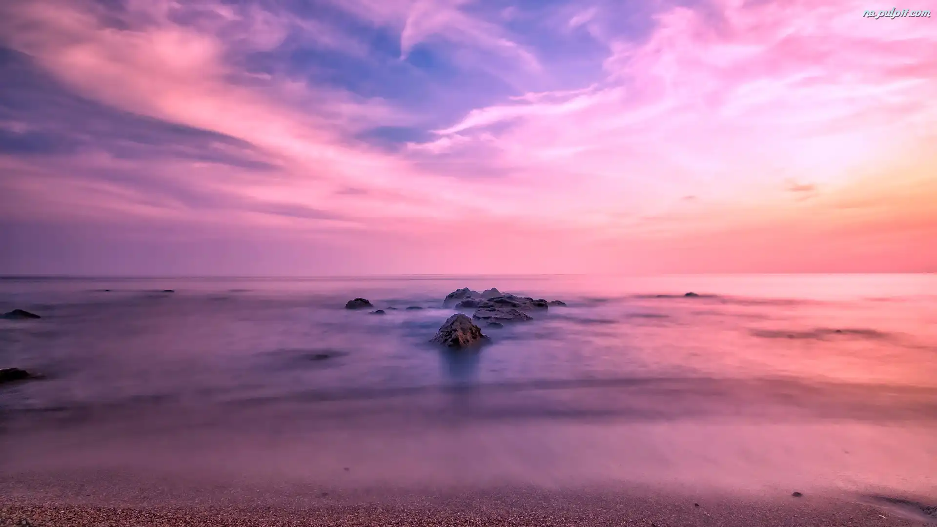 Morze, Skały, Wschód słońca, Brzeg, Plaża, Piasek Na Pulpit