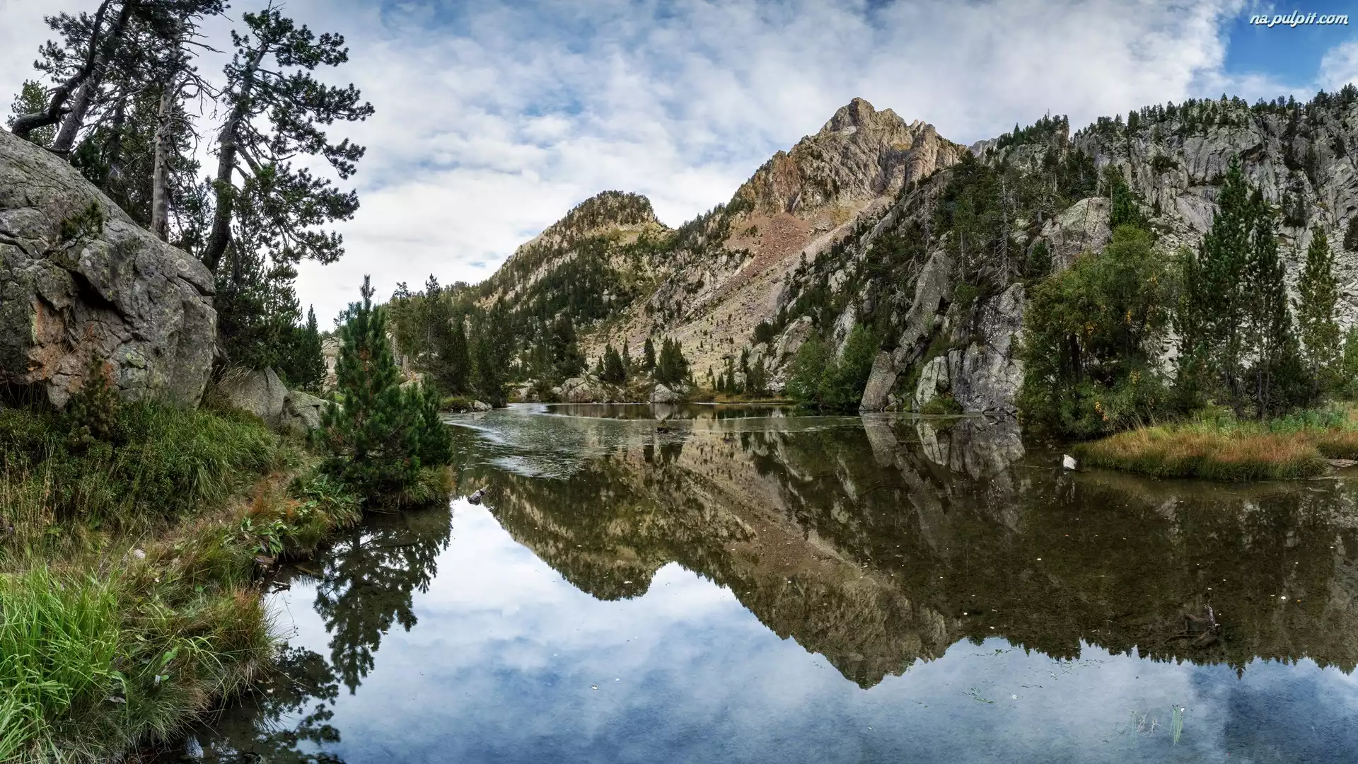Chmury, Góry, Drzewa, Skały, Jezioro, Odbicie Na Pulpit