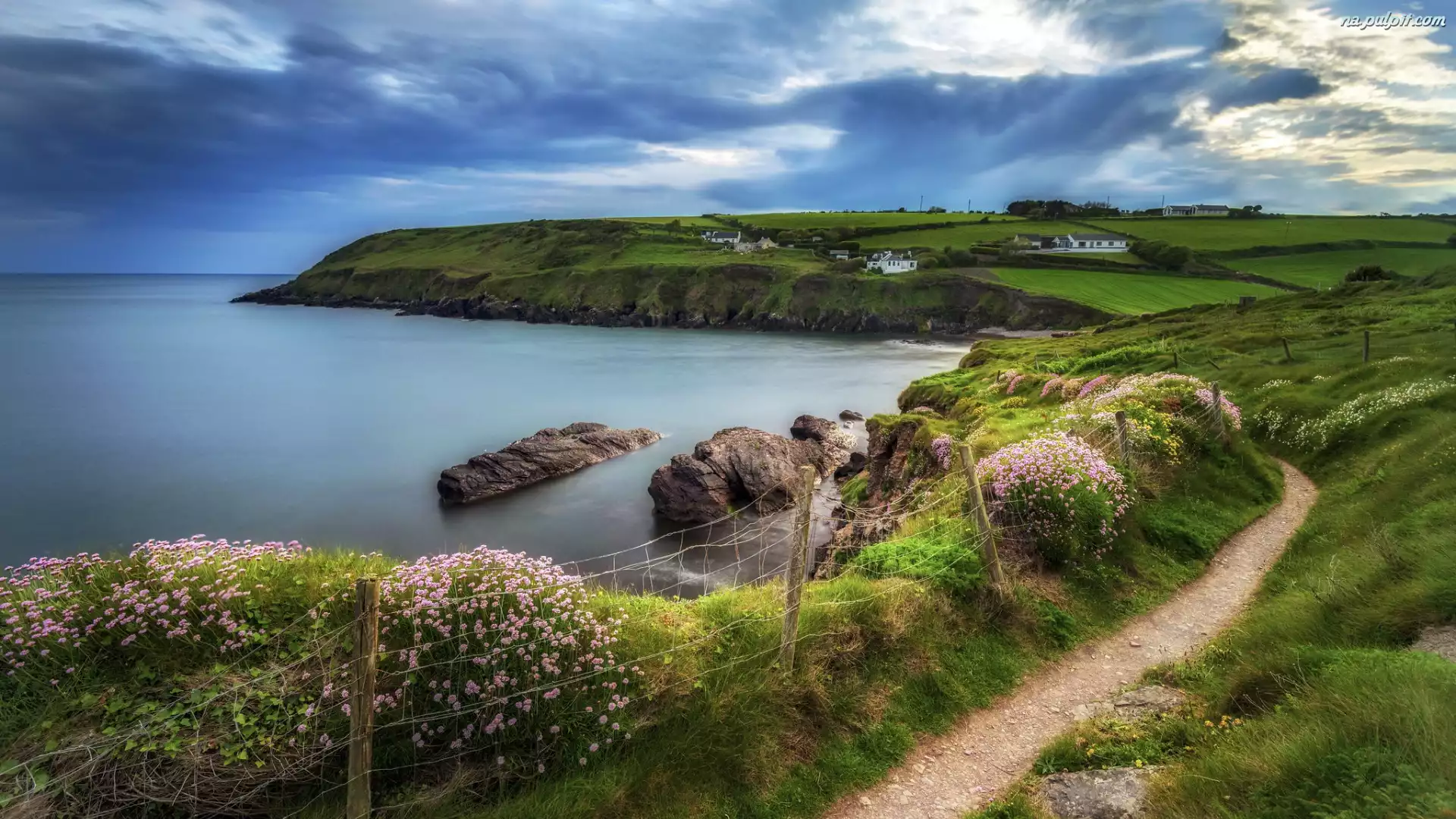 Ogrodzenie, Skały, Ścieżka, Niebo, Wybrzeże, Morze, Kwiaty Na Pulpit