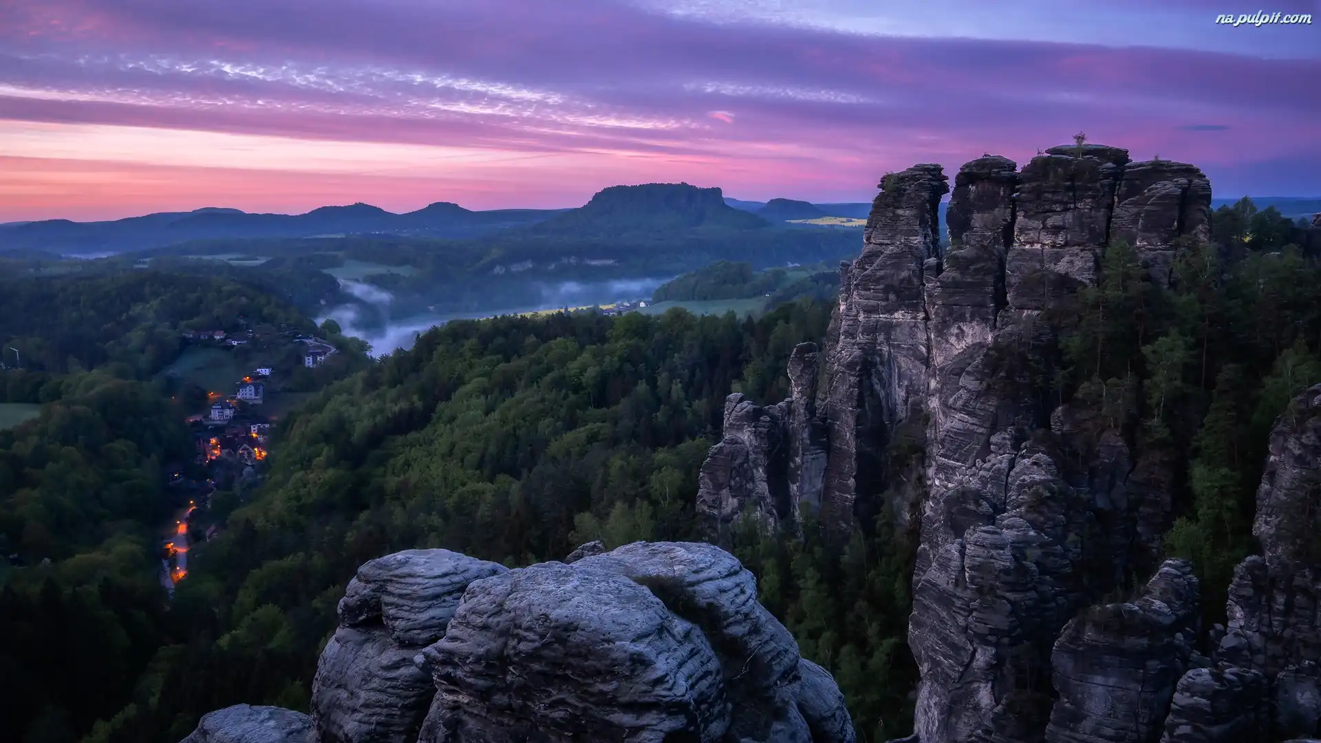 Skały, Domy, Niemcy, Las, Drzewa, Park Narodowy Saskiej Szwajcarii, Saksonia, Zachód słońca, Światła, Góry Połabskie, Mgła Na Pulpit |
