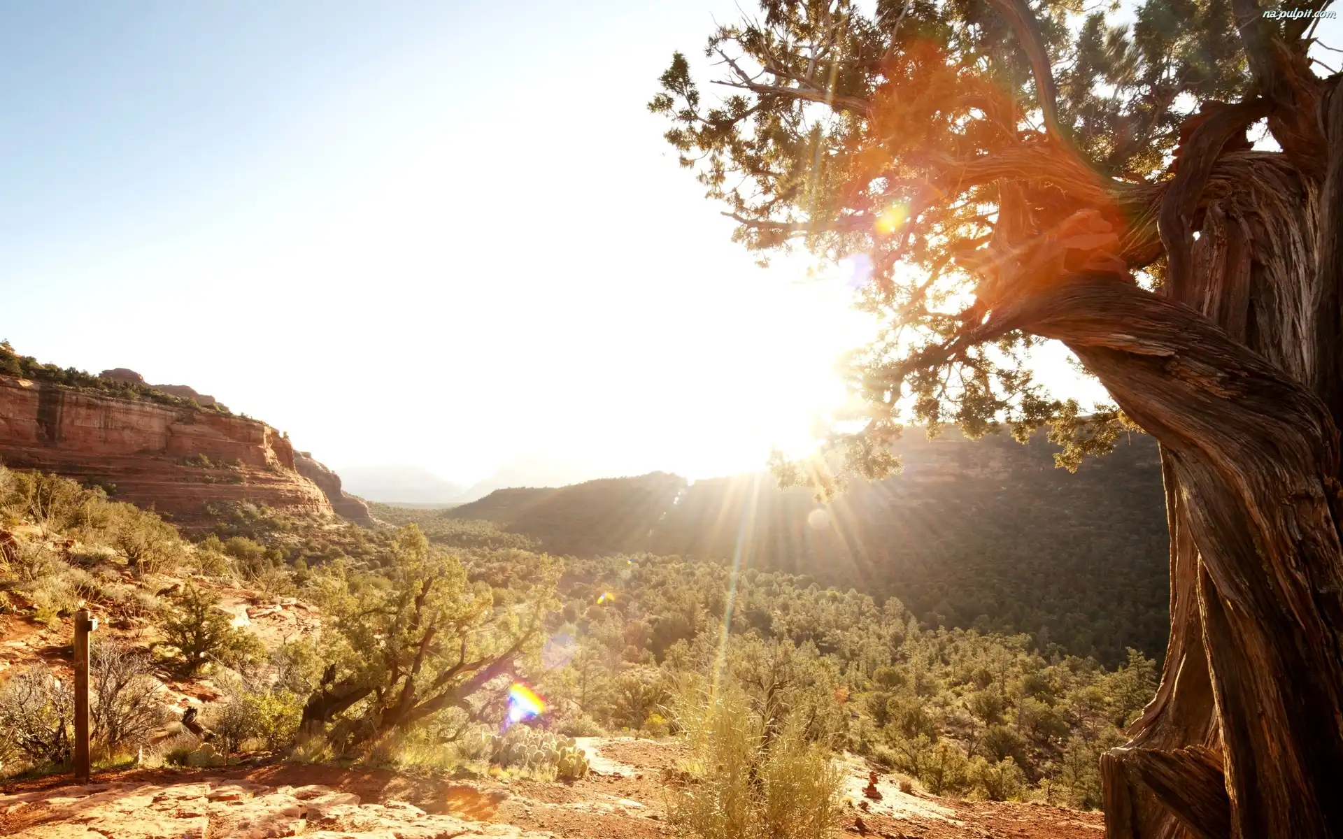 Skały, Promienie, Słońca, Rośliny, Pustynia, Drzewo