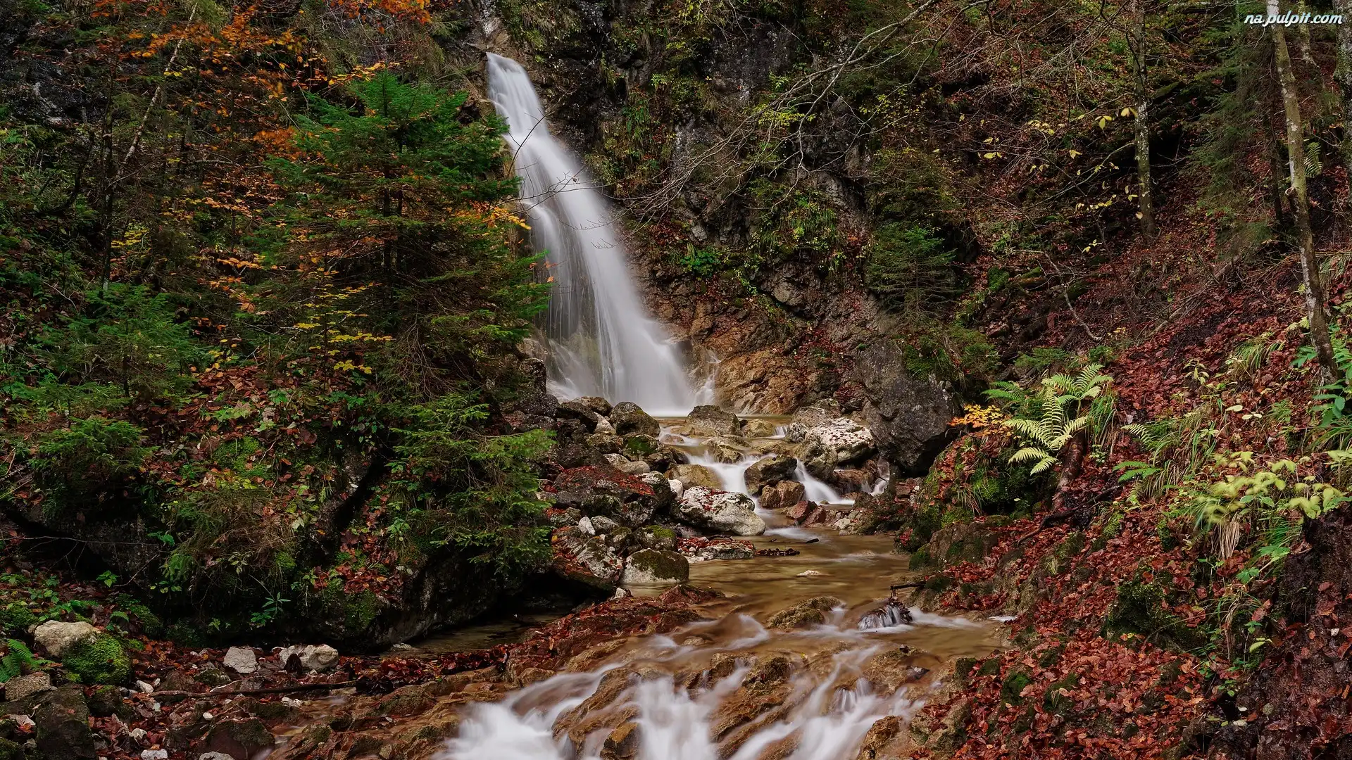 Las, Brązowe, Rośliny, Skały, Wodospad, Rzeka, Liście Na Pulpit