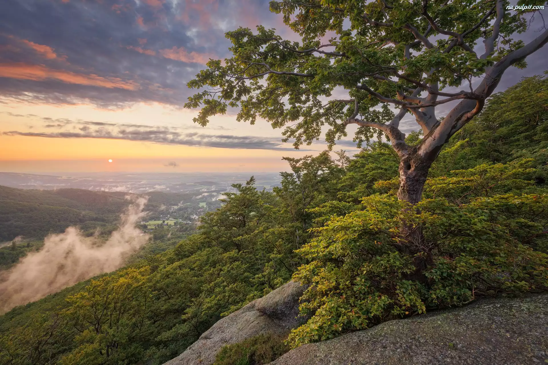 Krzewy, Zachód słońca, Skały, Drzewa, Góry, Chmury Na Pulpit