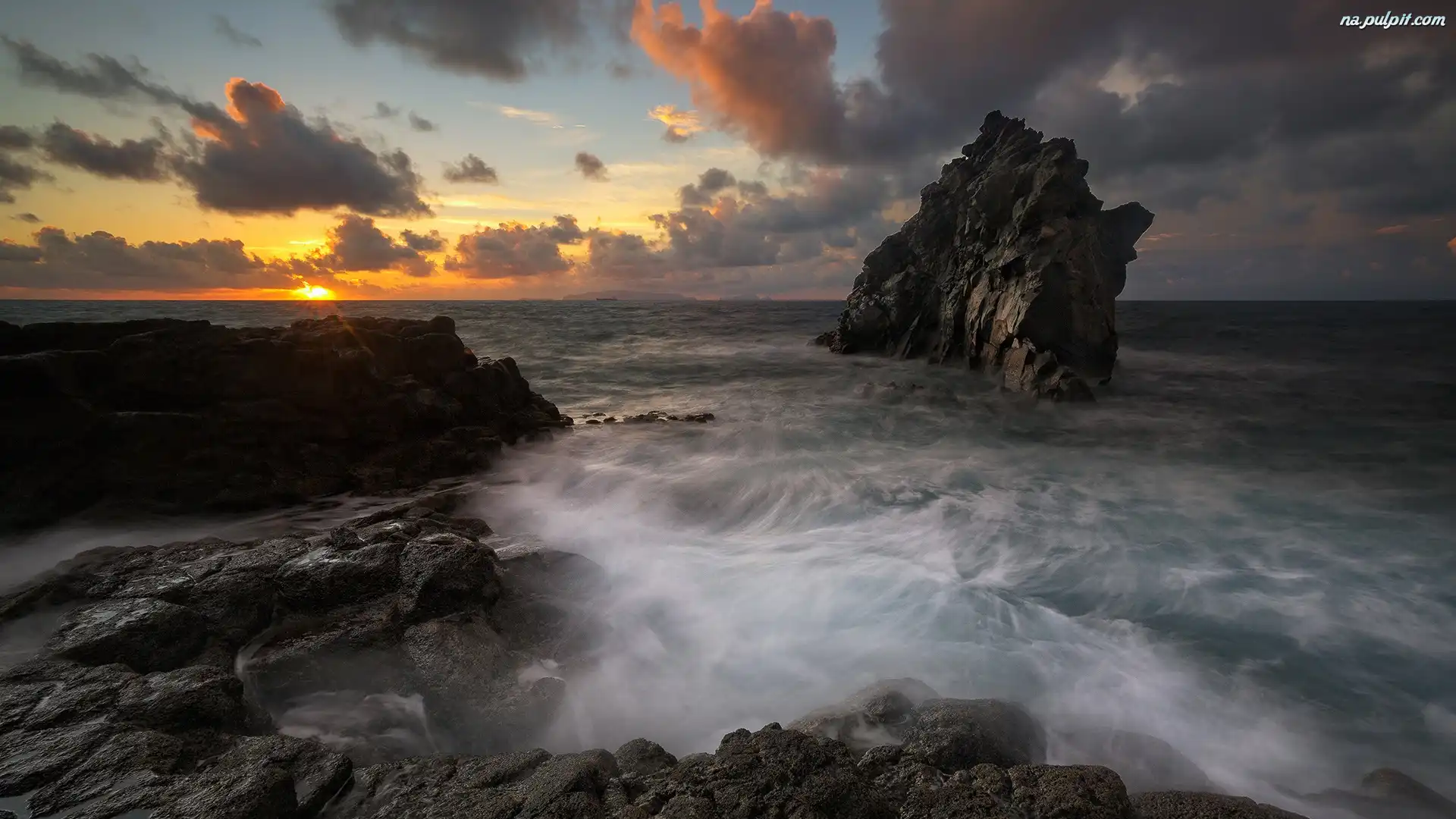 Skały, Ocean, Zachód słońca, Morze Na Pulpit