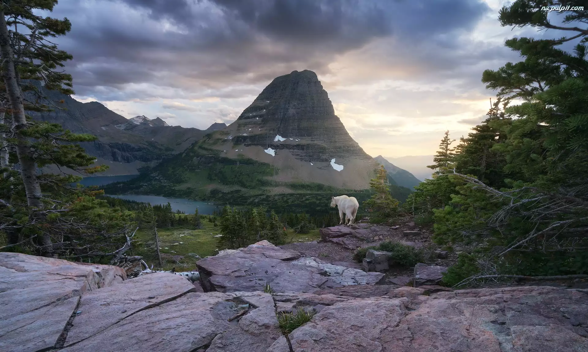 Jezioro, Stany Zjednoczone, Las, Kozioł śnieżny, Drzewa, Stan Montana, Park Narodowy Glacier, Hidden Lake, Chmury, Góry, Skały Na Pulpit |