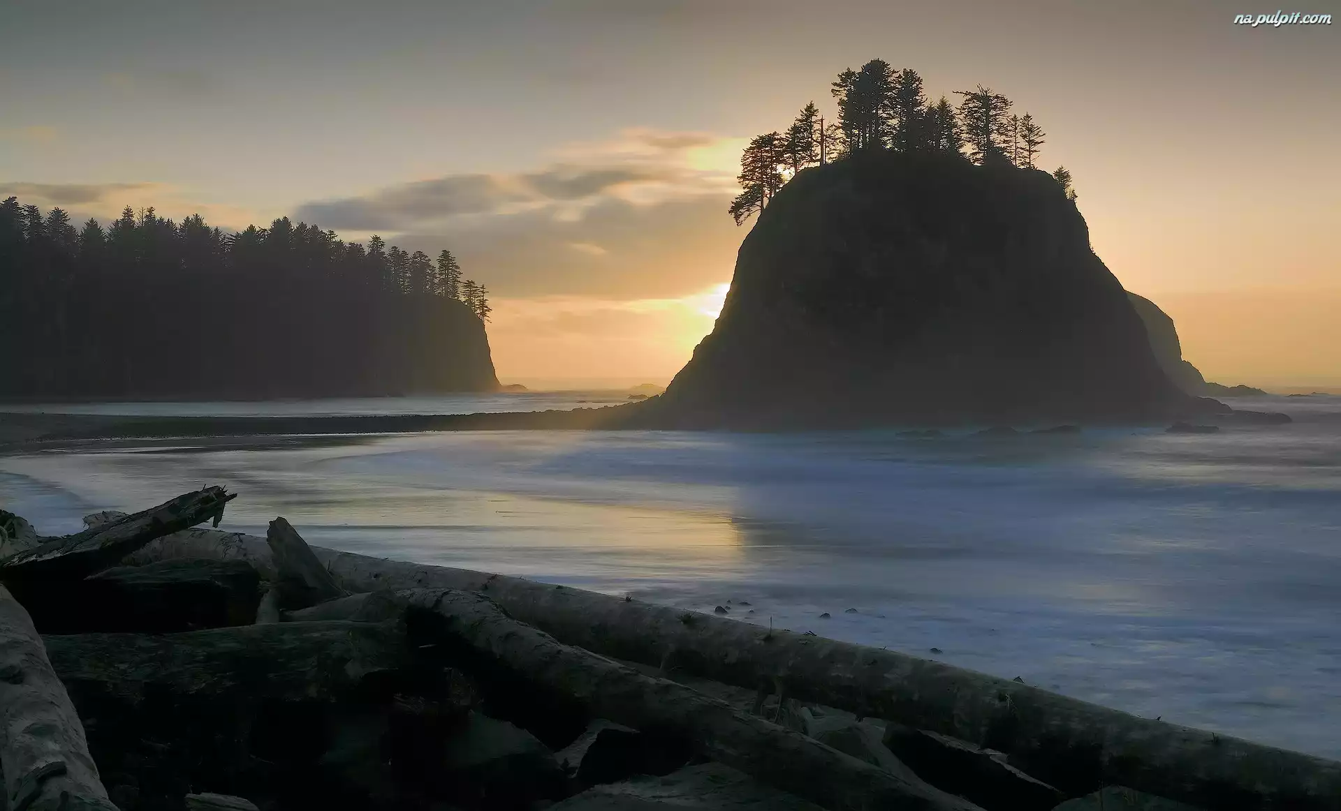 Zachód słońca, Stany Zjednoczone, Drzewa, Plaża, Niebo, Stan Waszyngton, Park Narodowy Olympic, Morze, Chmury, Rialto Beach, Skały Na Pulpit |