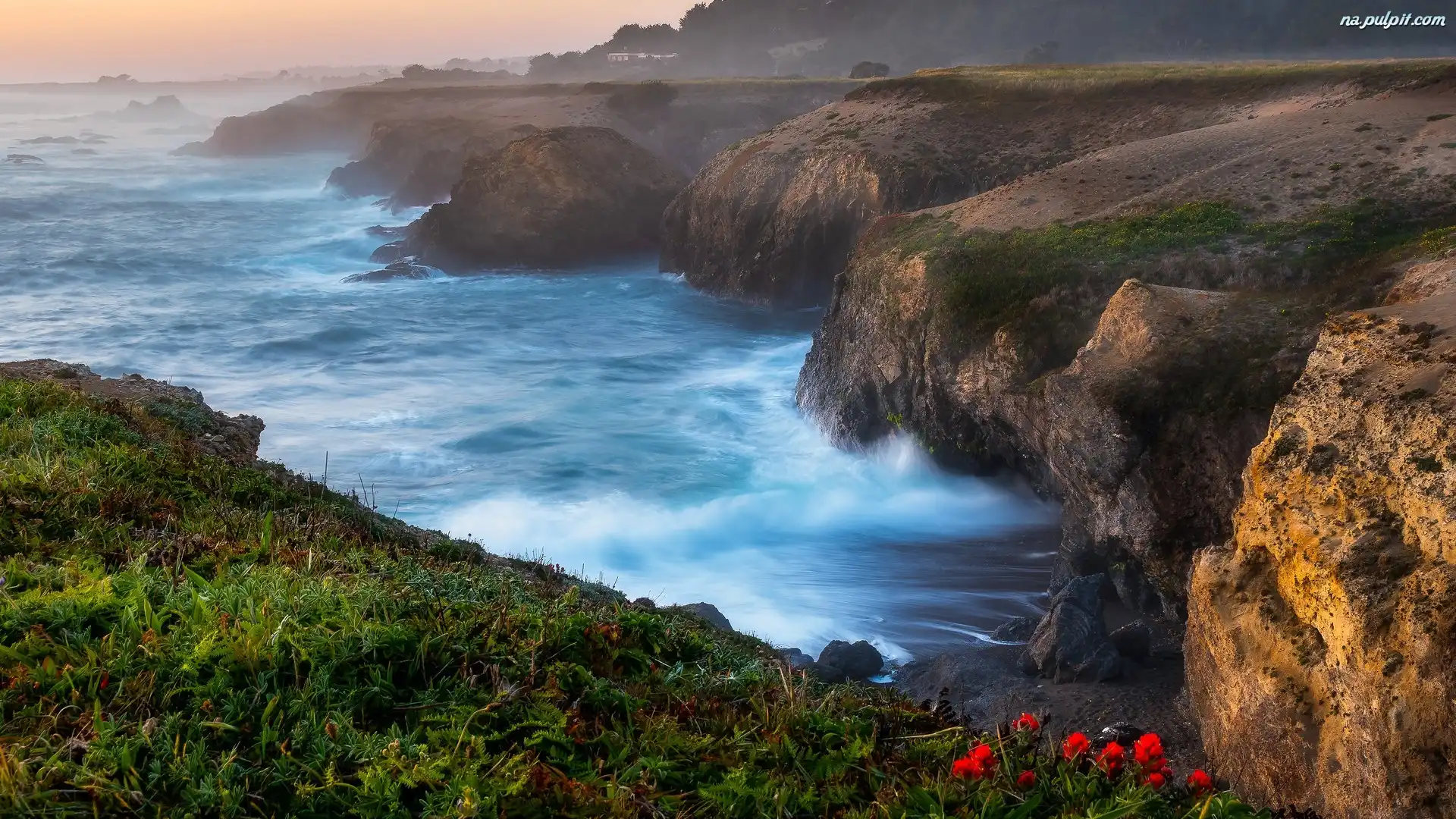 Kalifornia, Stany Zjednoczone, Skały, Mgła, Rośliny, Klif, Morze, Park Stanowy Van Damme, Kwiaty Na Pulpit |