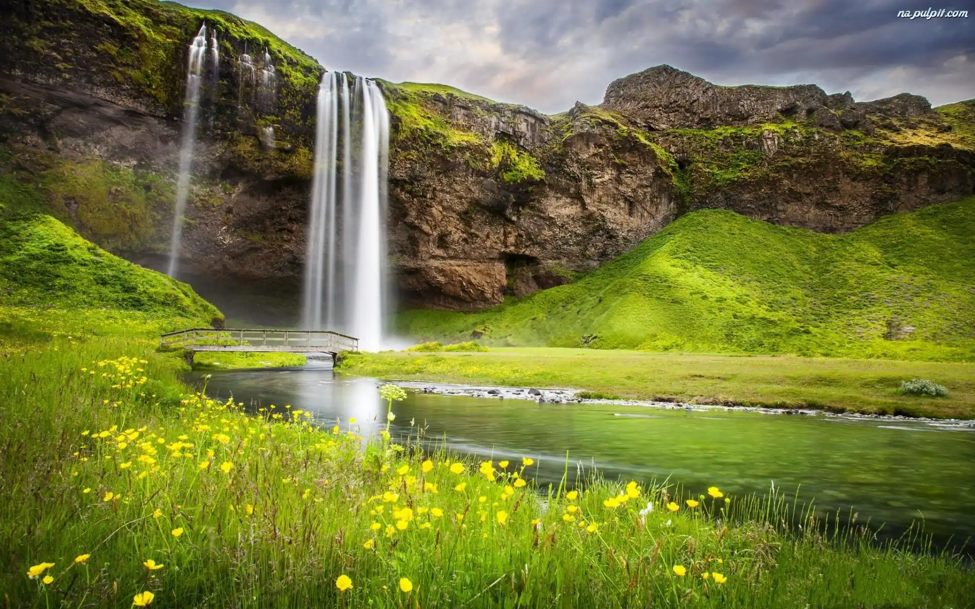Wiosna, Skały, Kwiaty, Mostek, Rzeczka, Wodospad, Łąka Na Pulpit