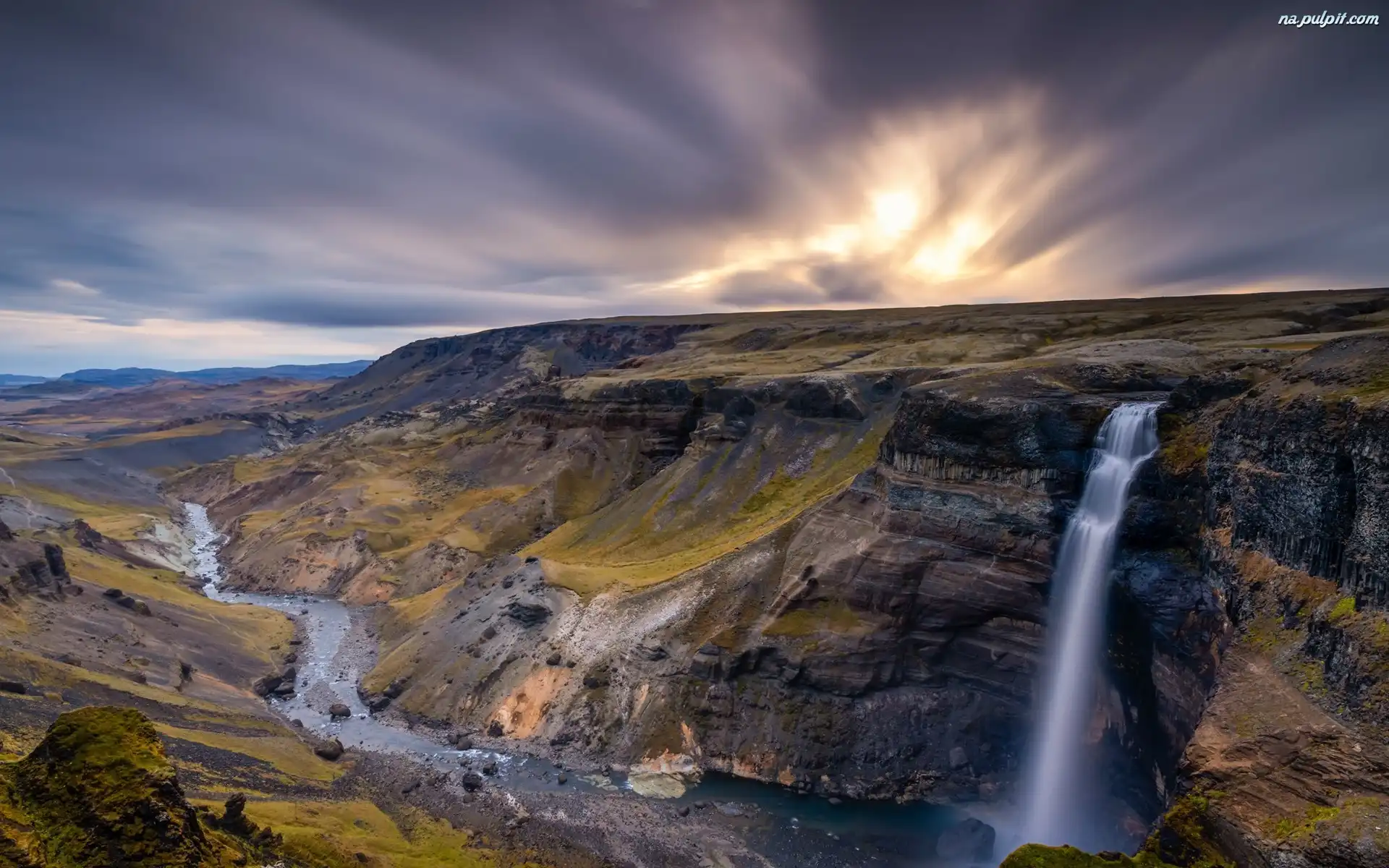 Góry, Islandia, Wodospad Haifoss, Chmury, Rzeka Fossa, Skały Na Pulpit