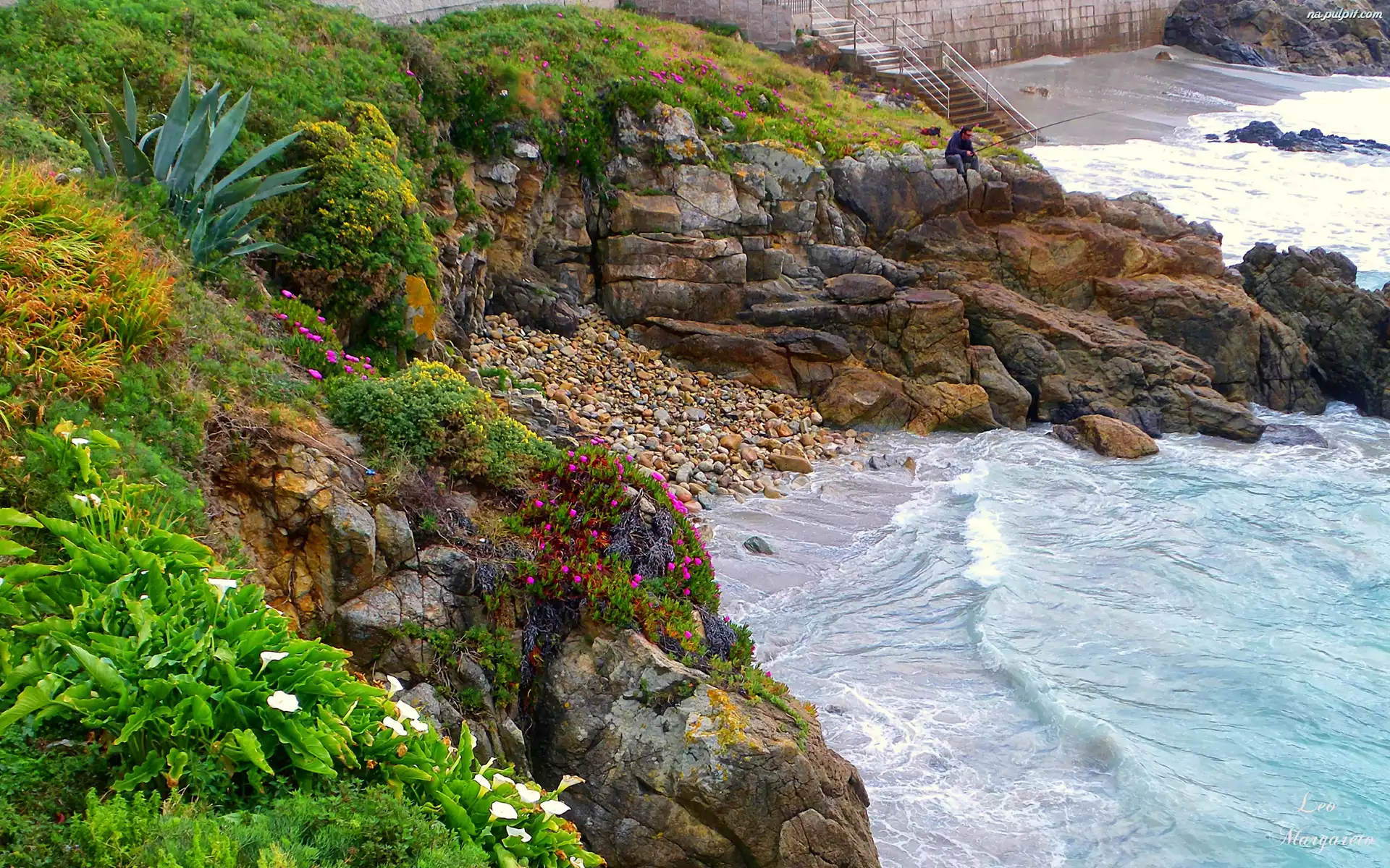 Skały, Mężczyzna, Wędkarz, Fale, Wybrzeże, Kwiaty