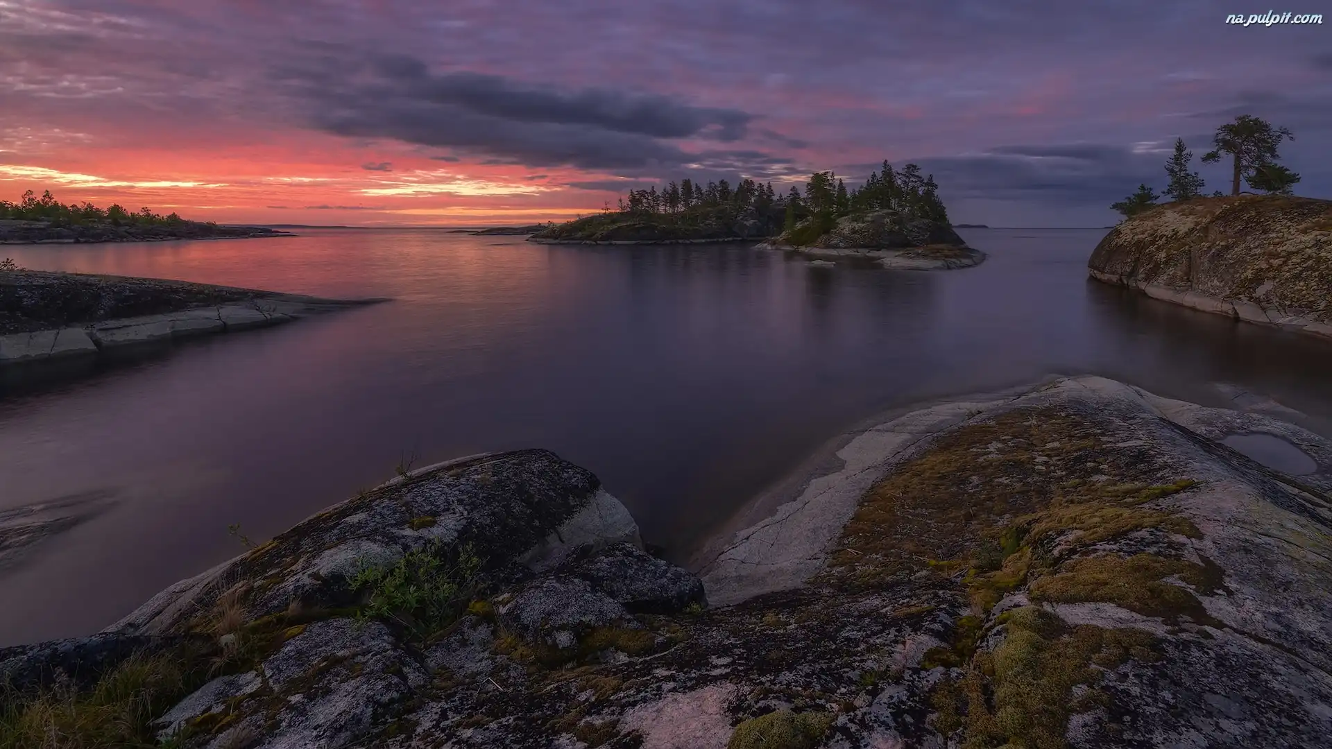 Drzewa, Karelia, Wysepka, Zachód słońca, Jezioro Ładoga, Rosja, Skały Na Pulpit