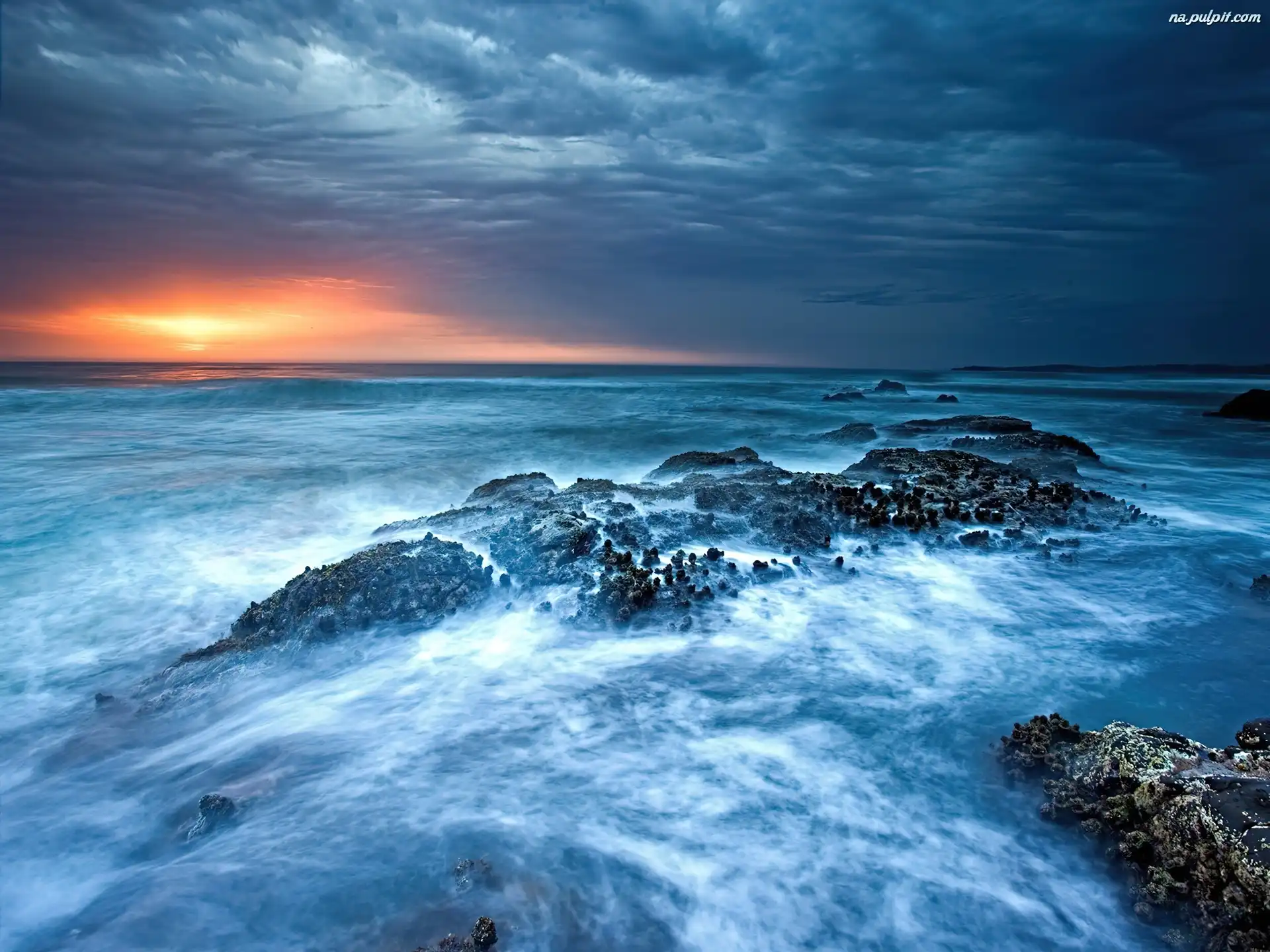Skały, Fale, Słońca, Zachód, Morze Na Pulpit