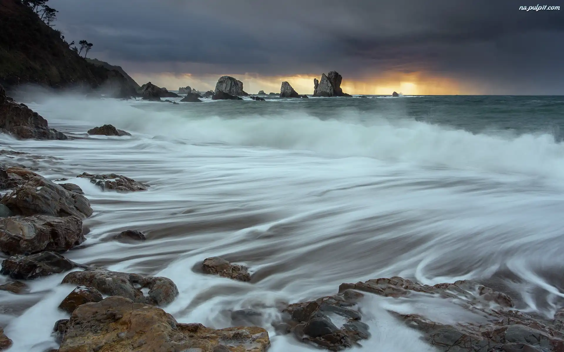 Skały, Morze, Słońca, Zachód, Fale Na Pulpit