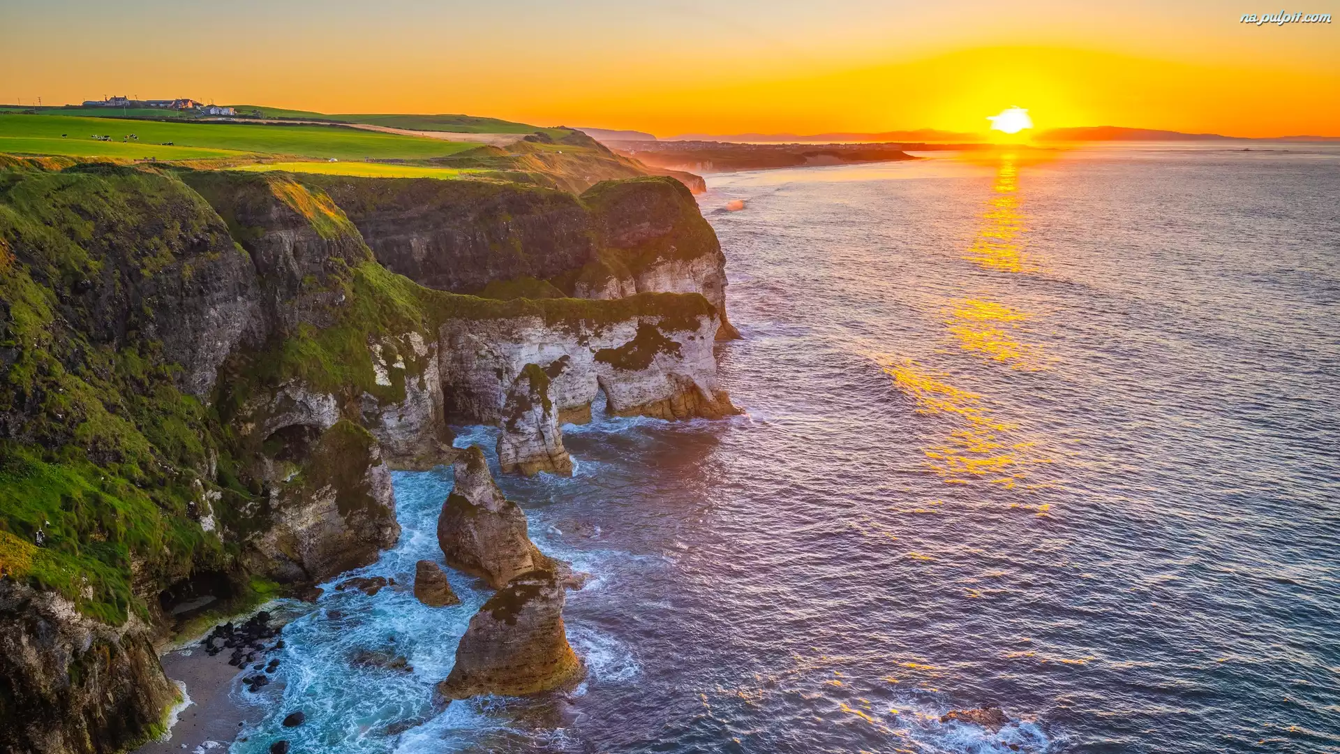 Skały, Klif, Wybrzeże, Irlandia Północna, Hrabstwo Antrim, Morze, Zachód słońca Na Pulpit