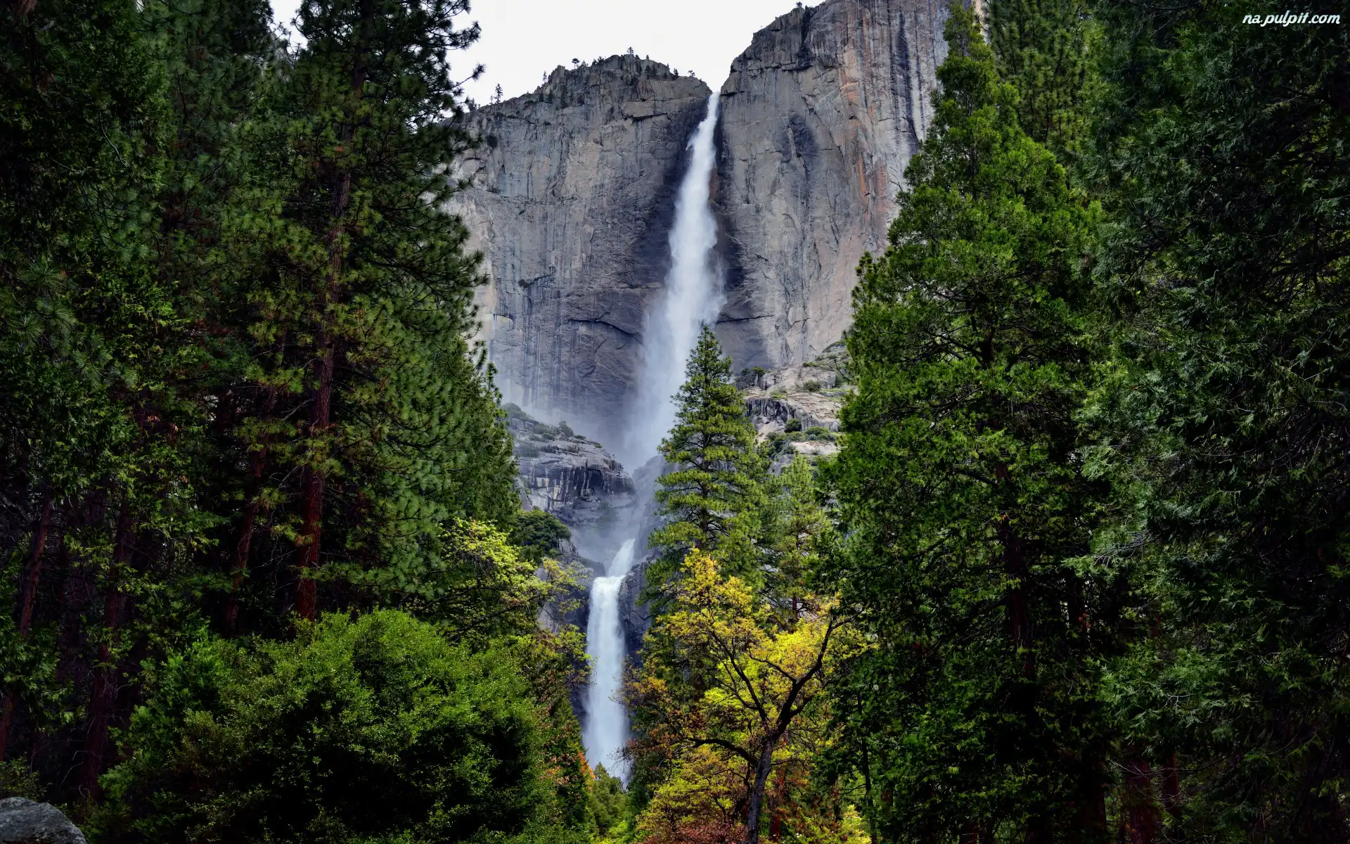 Upper Yosemite Falls, Skały, Park Narodowy Yosemite, Góry, Stany Zjednoczone, Kalifornia, Drzewa, Wodospad Na Pulpit |