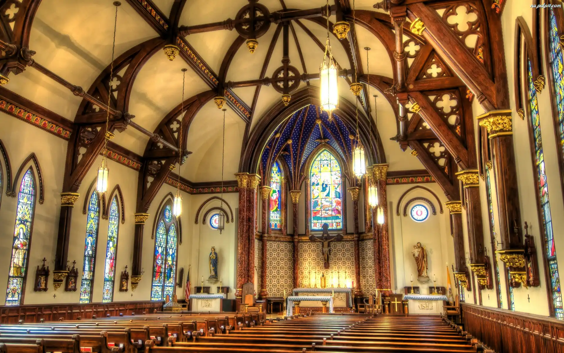 Sklepienie, Witraże, Ławki, Kościół, Ołtarz