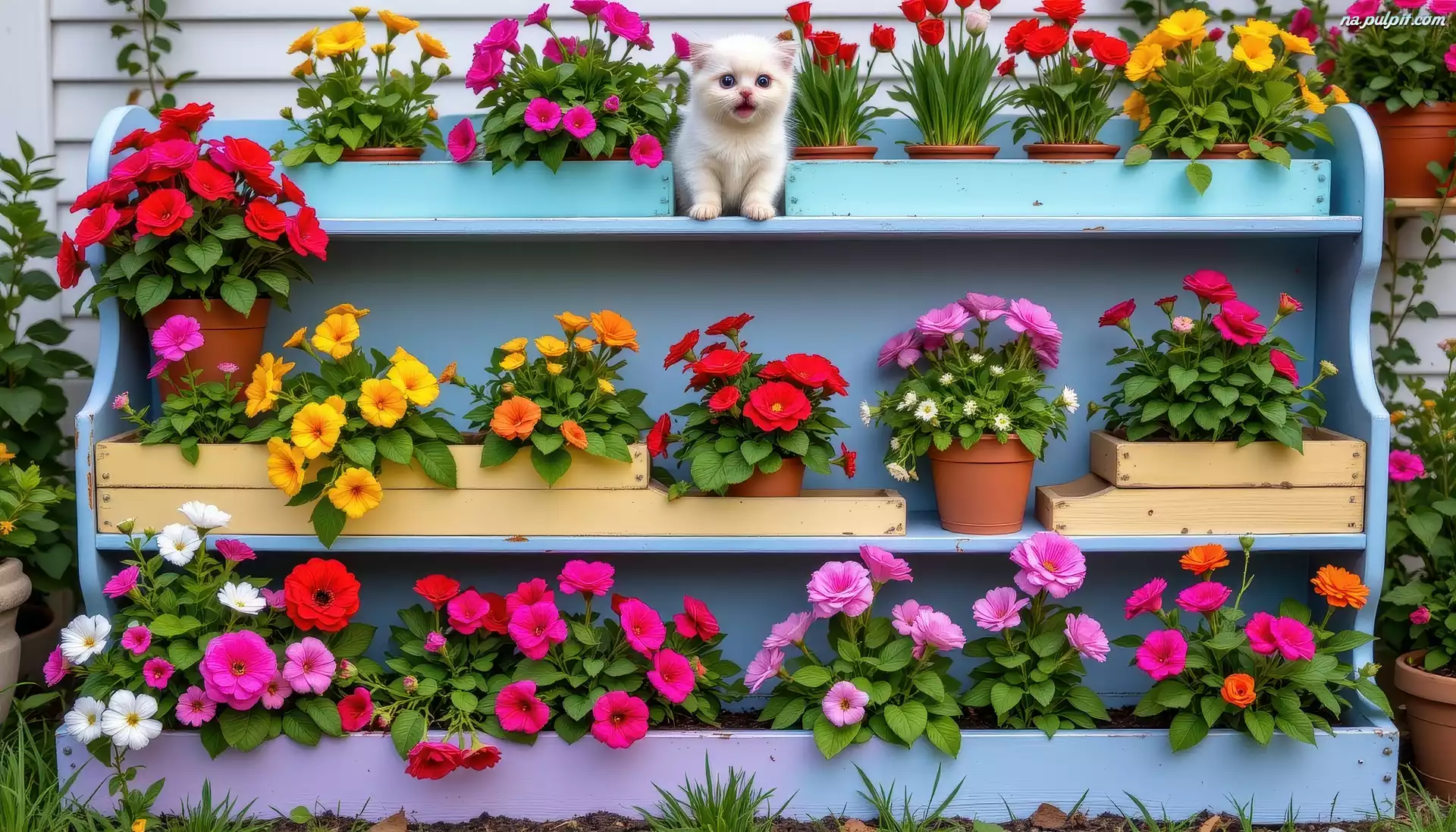 Półki, Kot, Doniczki, Skrzynki, Kwiaty, Niebieskie Na Pulpit
