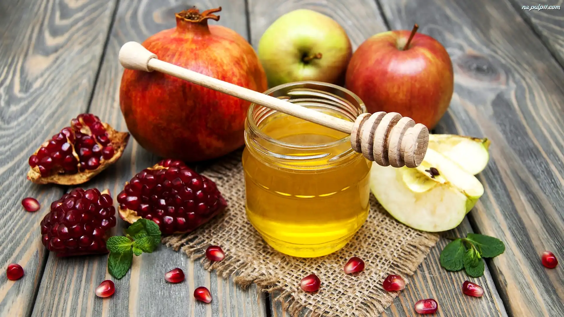 Słoik, Serwetka, Deski, Granat, Miód, Jabłka Na Pulpit