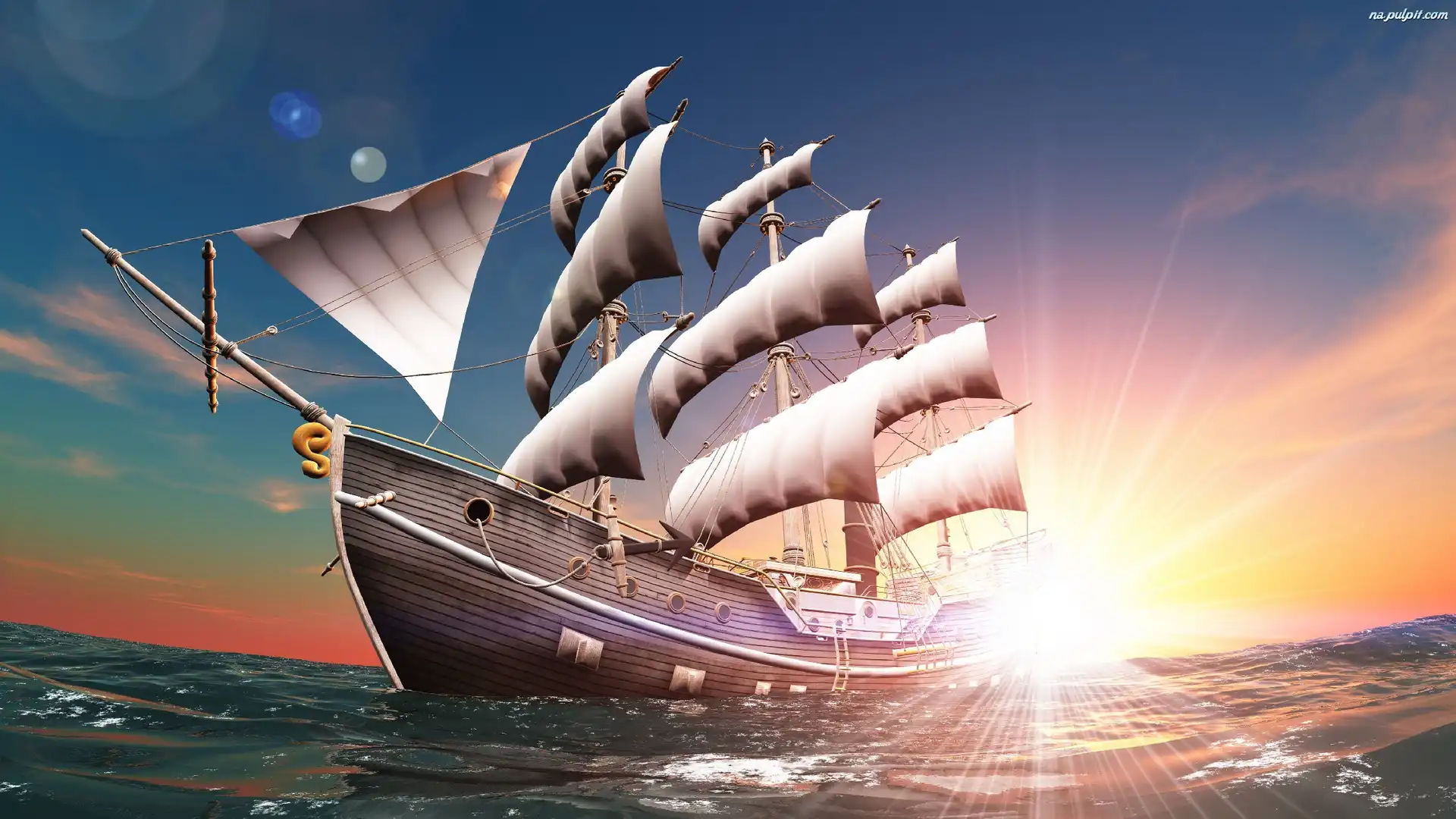 Słońca, Morze, Żaglowiec, Promienie Na Pulpit