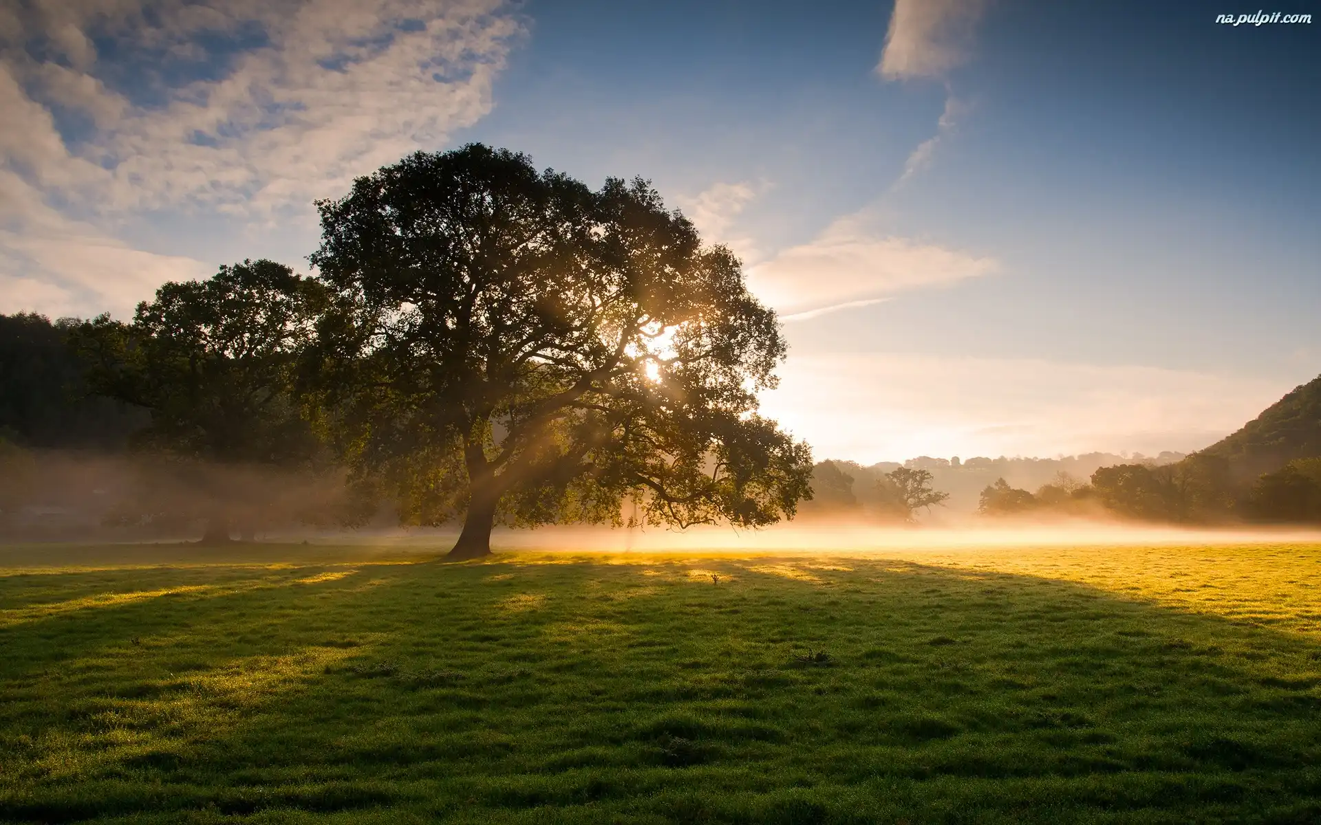 Słońca, Mgła, Drzewa, Łąka, Promienie Na Pulpit
