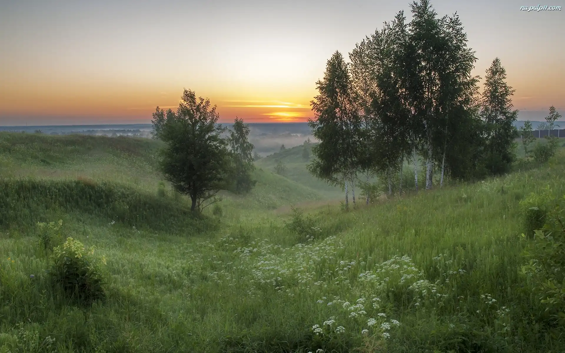 Słońca, Drzewa, Kwiaty, Łąki, Zachód