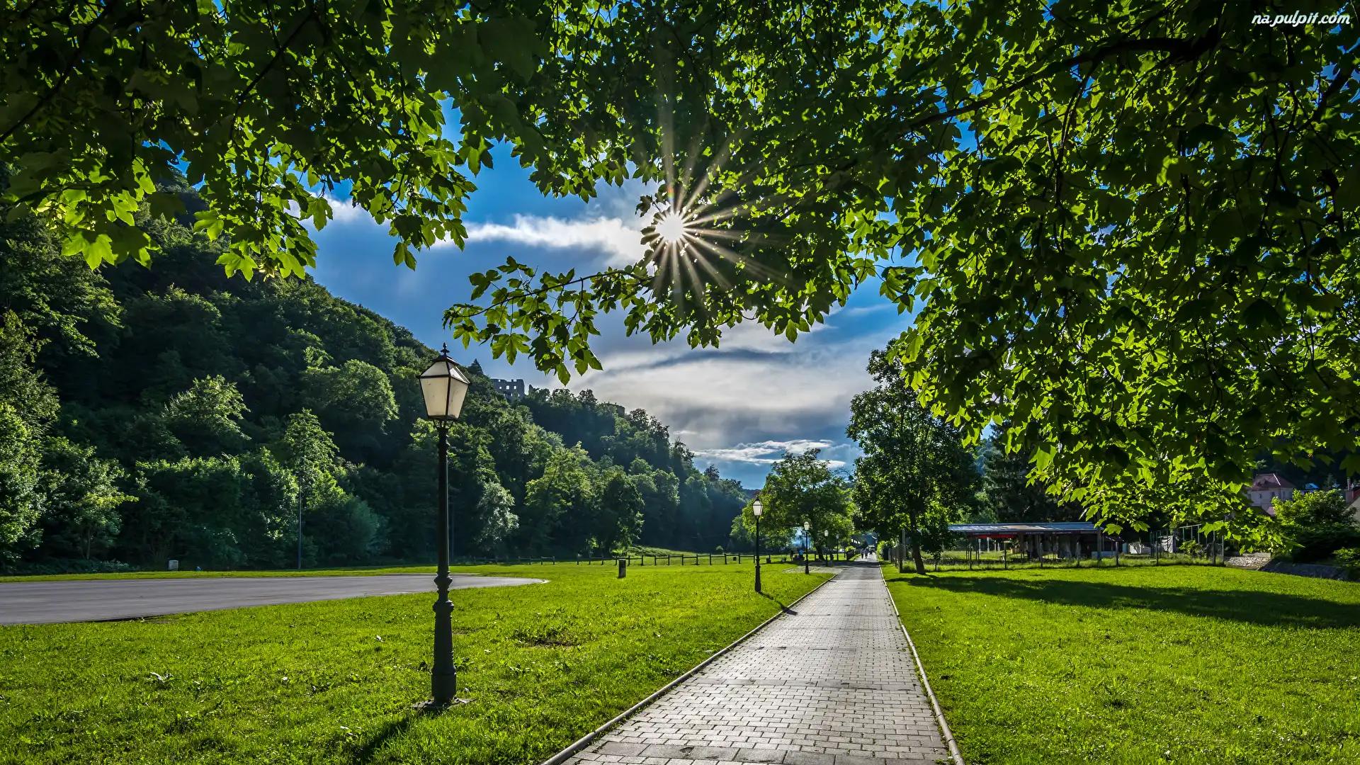 Promienie słońca, Samobor, Latarnie, Drzewa, Park, Chorwacja, Alejka Na Pulpit