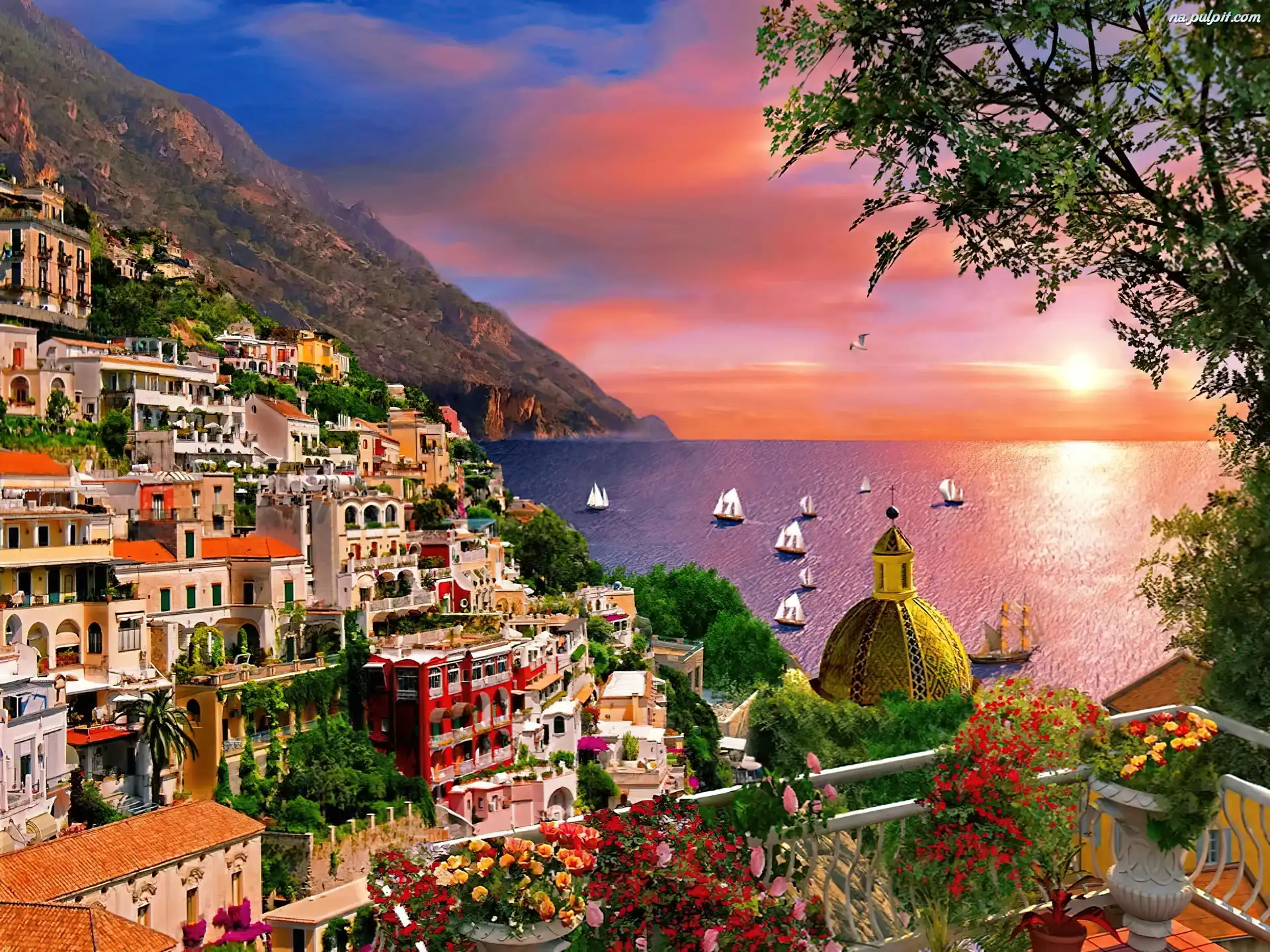 Słońca, Góra, Morze, Domy, Zachód Na Pulpit
