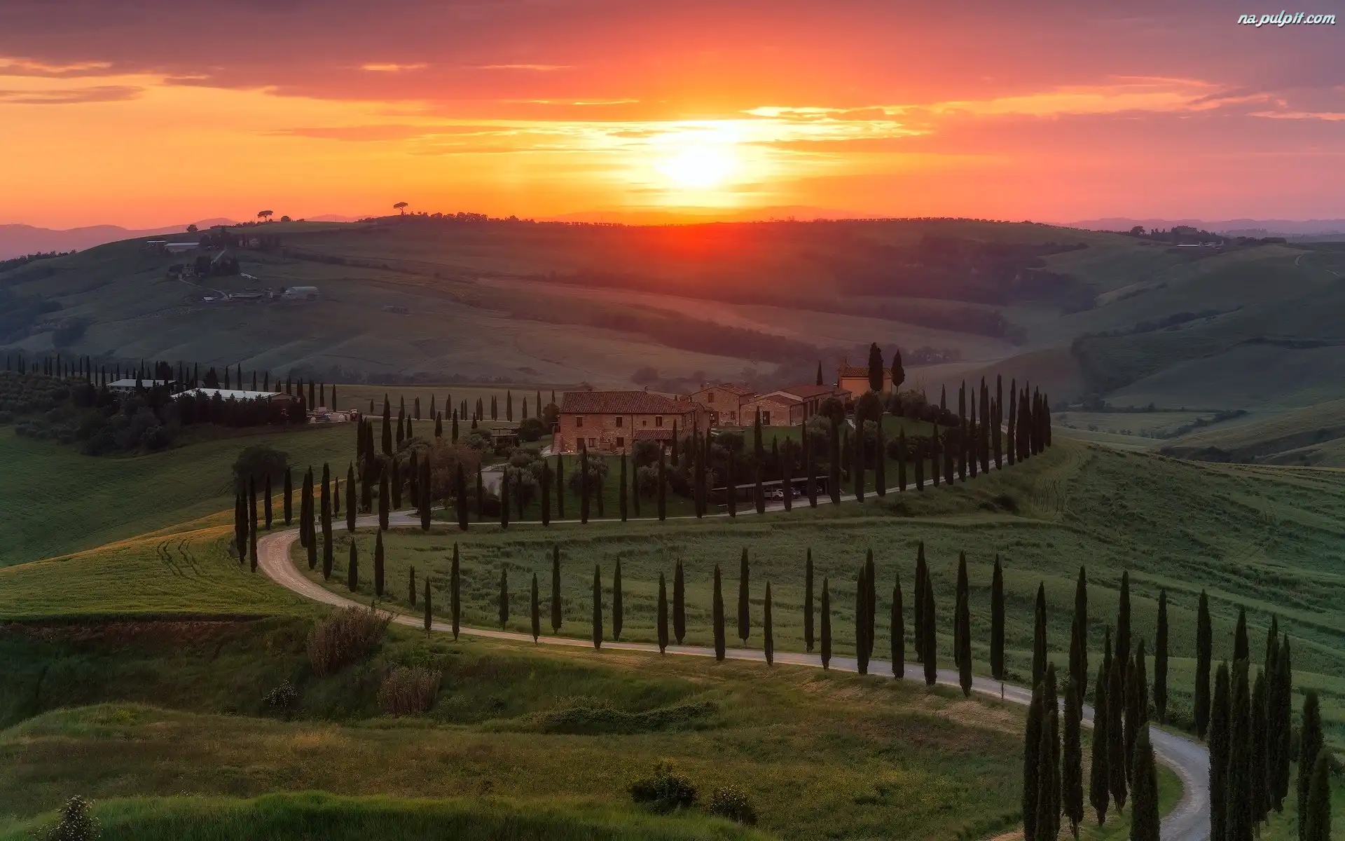 Wzgórza, Droga, Drzewa, Toskania, Włochy, Cyprysy, Domy, Zachód słońca Na Pulpit