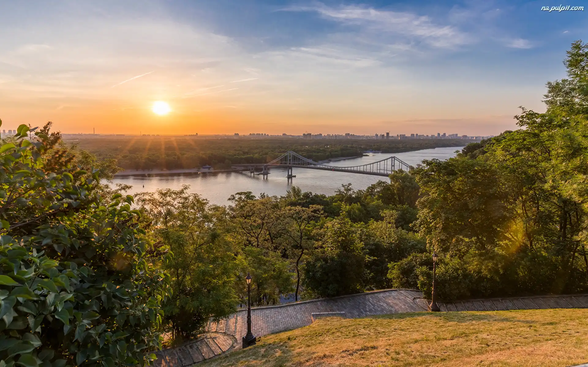 Latarnie, Kijów, Drzewa, Most, Rzeka Dniepr, Ukraina, Zachód słońca Na Pulpit