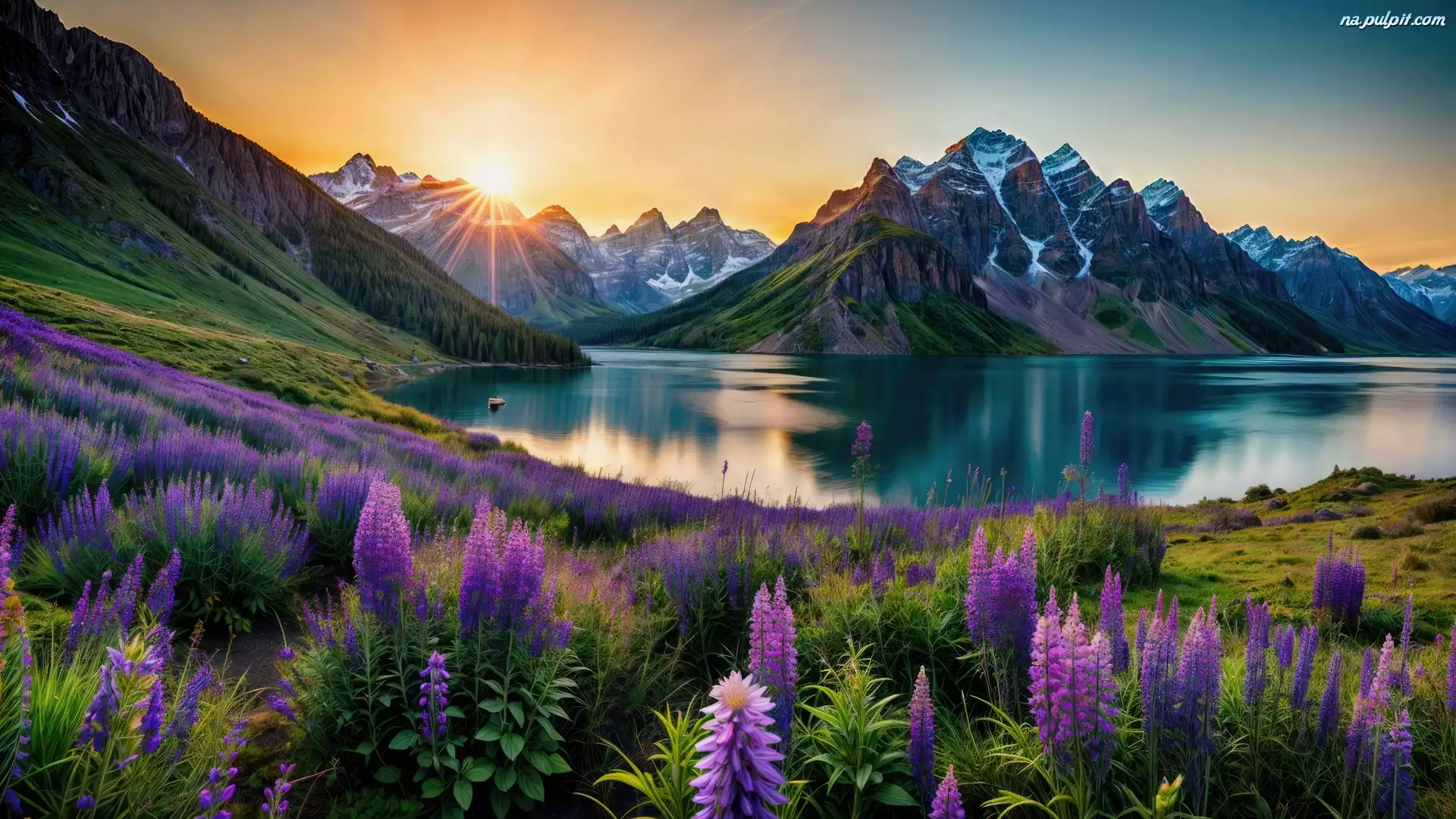 Łąka, Łubin, Drzewa, Gory, Jezioro, Las, Wschód słońca Na Pulpit