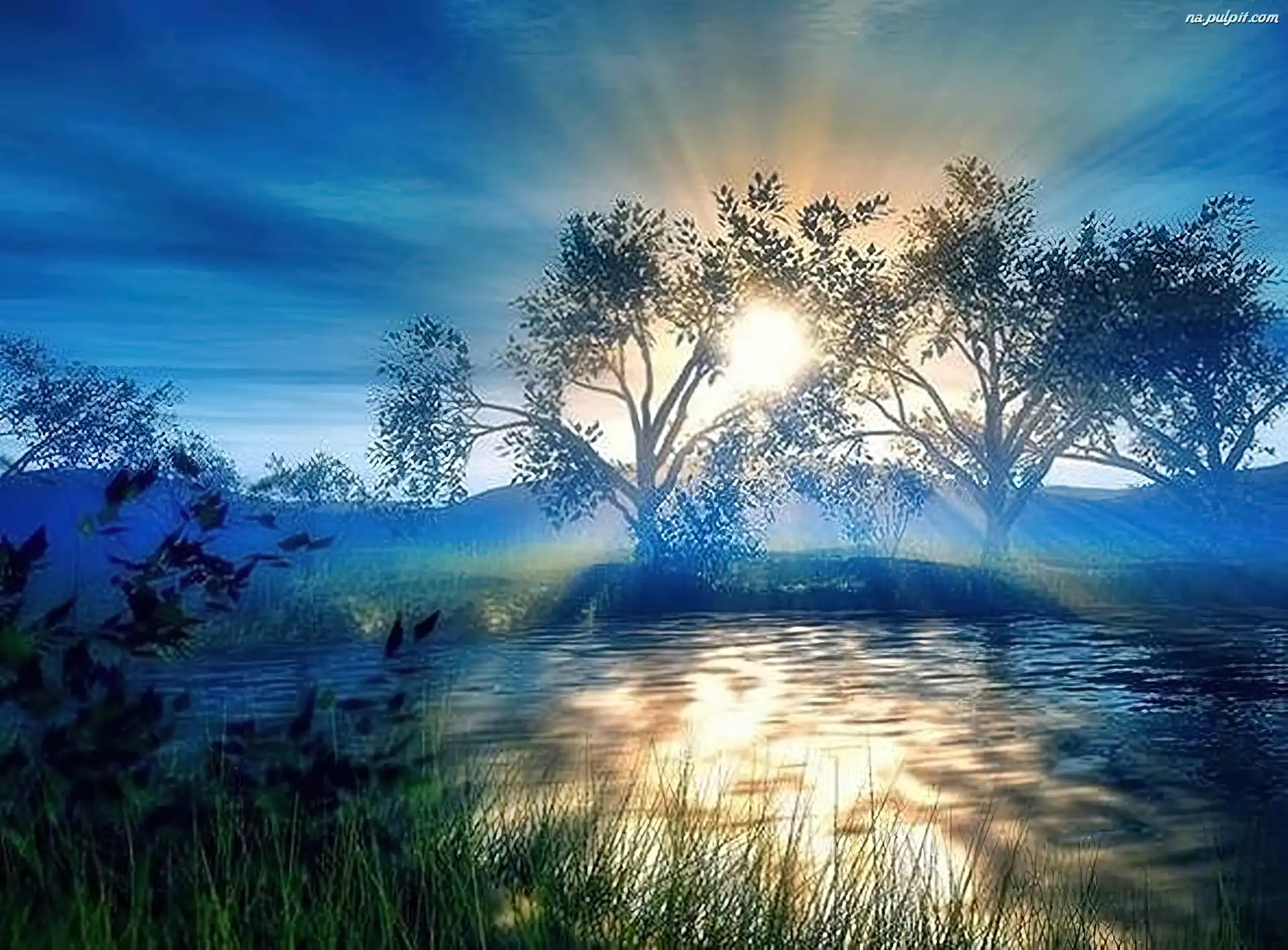 Słońca, Rzeka, Drzewa, Wschód