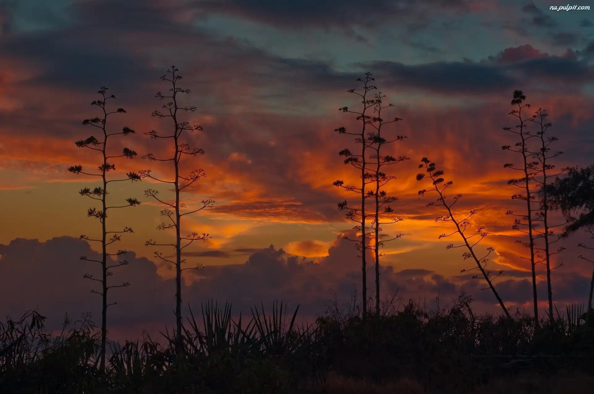 Słońca, Chmury, Trawy, Drzewa, Zachód