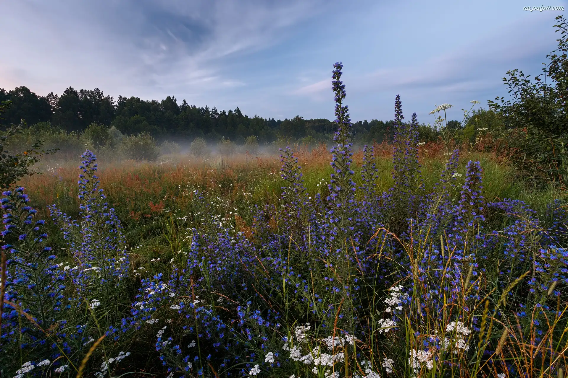 Wschód słońca, Kwiaty, Poranek, Mgła, Trawa, Łąka, Drzewa