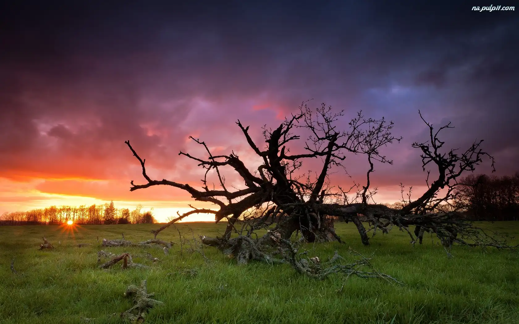 Słońca, Chmury, Drzewo, Zachód