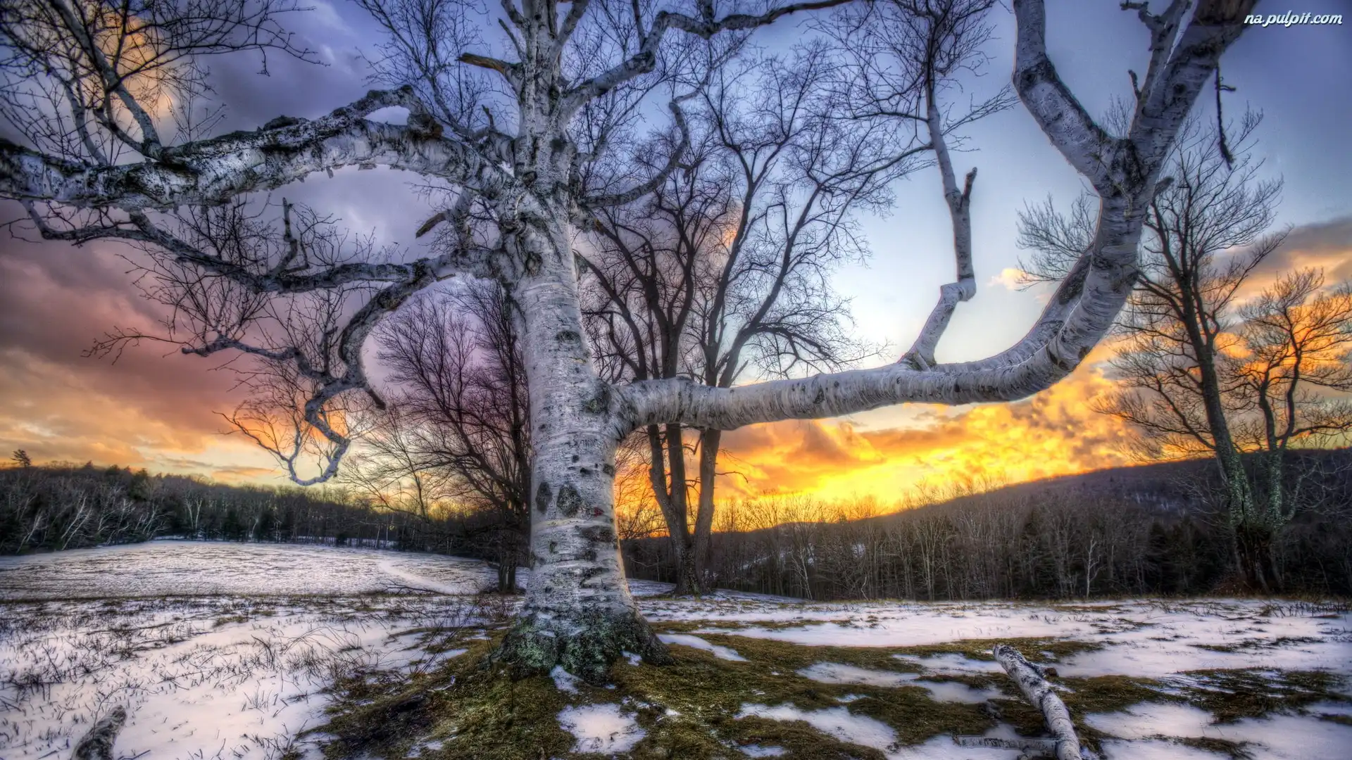 Słońca, Śnieg, Drzewo, Zachód