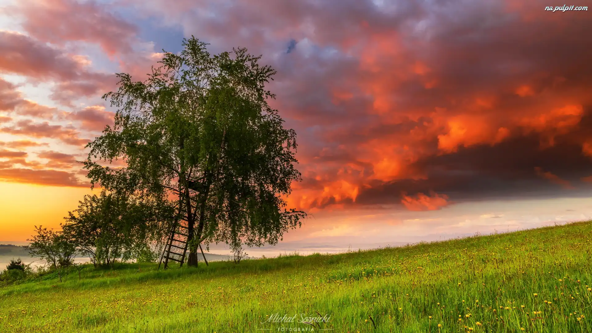 Łąka, Drzewo, Wschód słońca, Drabina Na Pulpit
