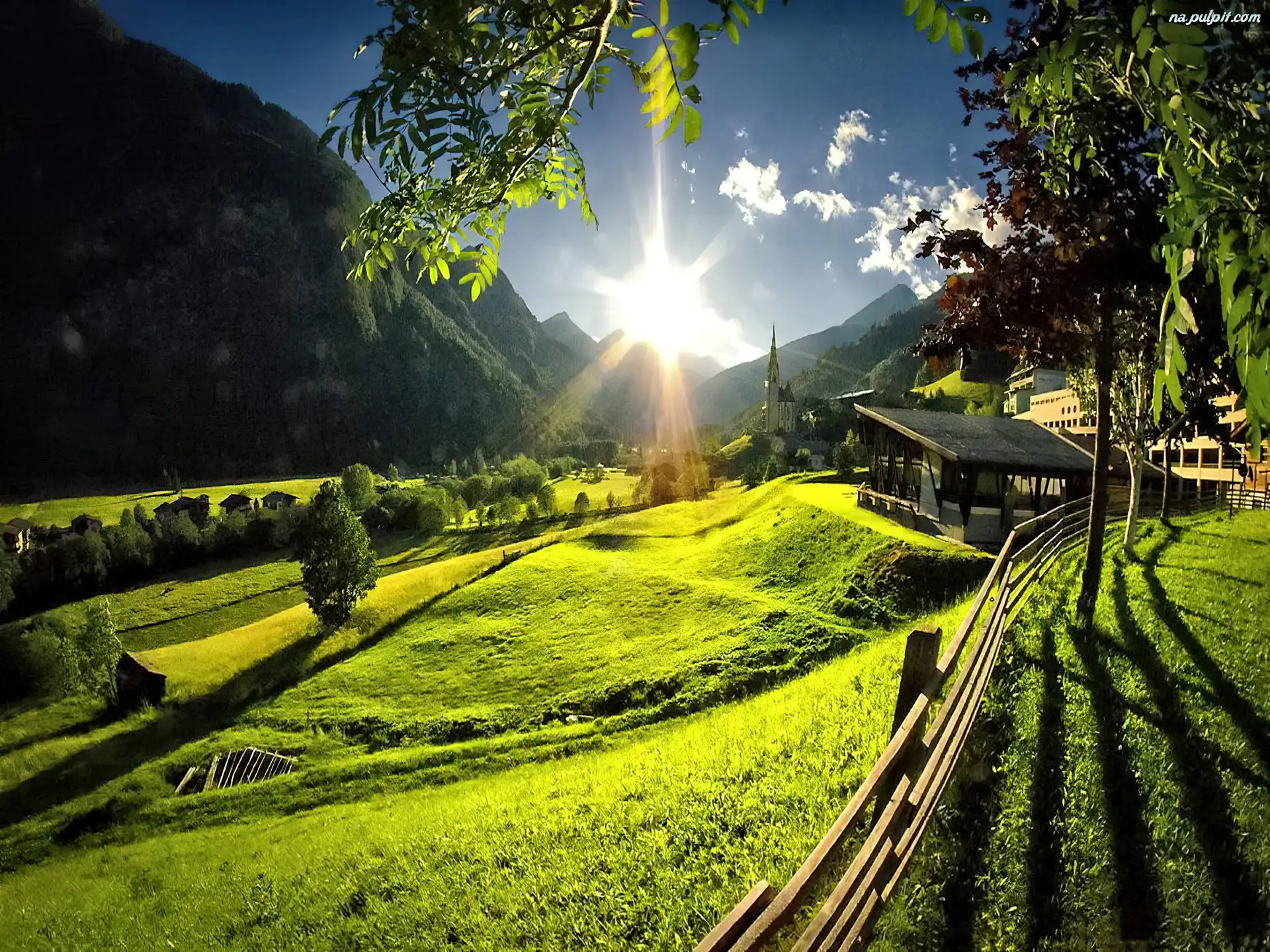 Słońca, Miasteczko, Dolina, Góry, Promienie