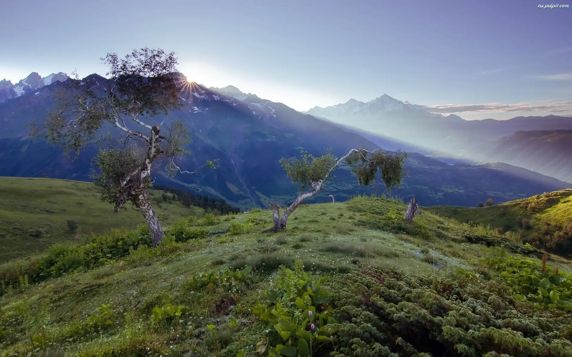 Słońca, Drzewa, Góry, Promienie Na Pulpit