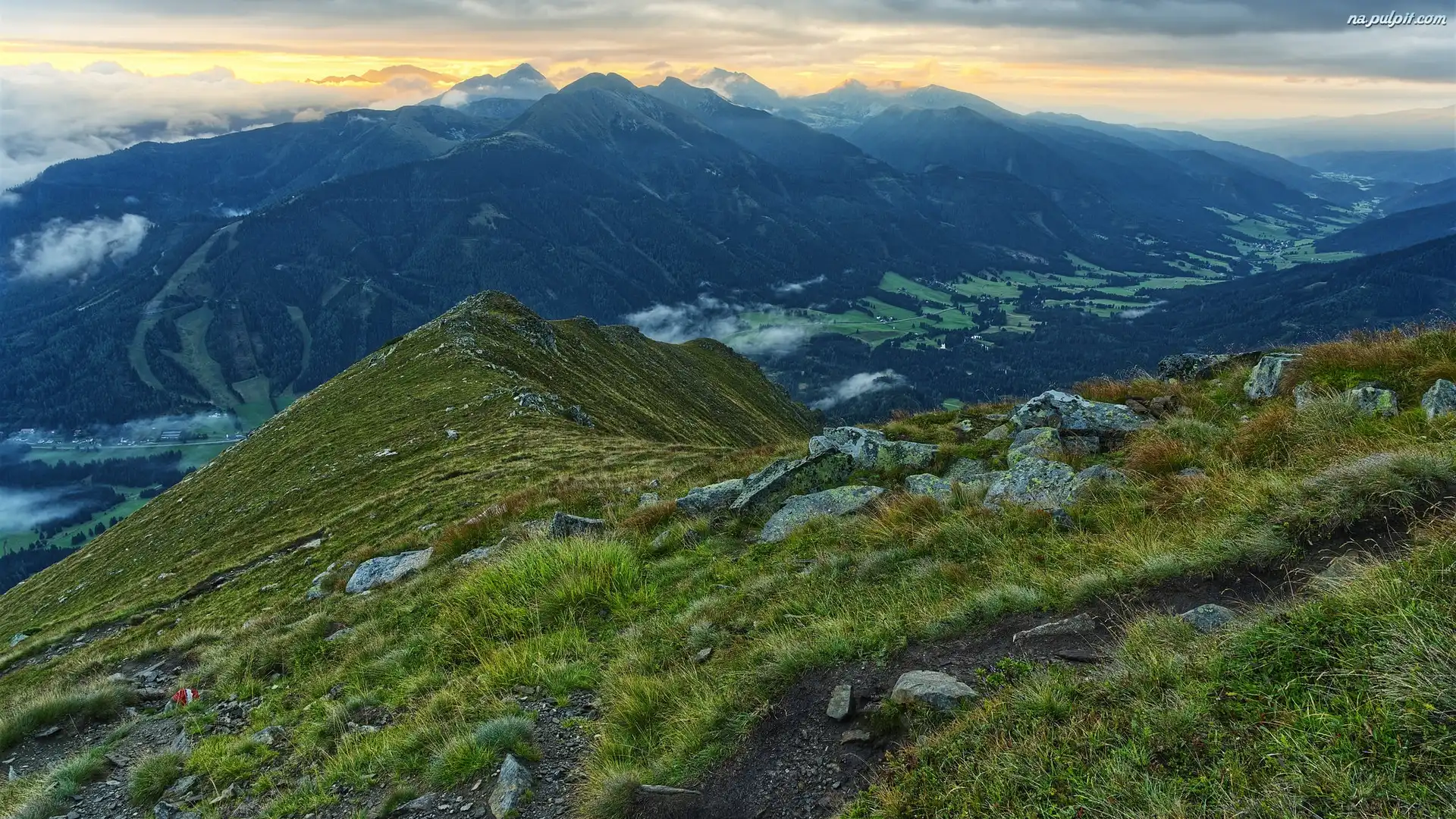 Wschód słońca, Góry, Zbocza, Drzewa Na Pulpit