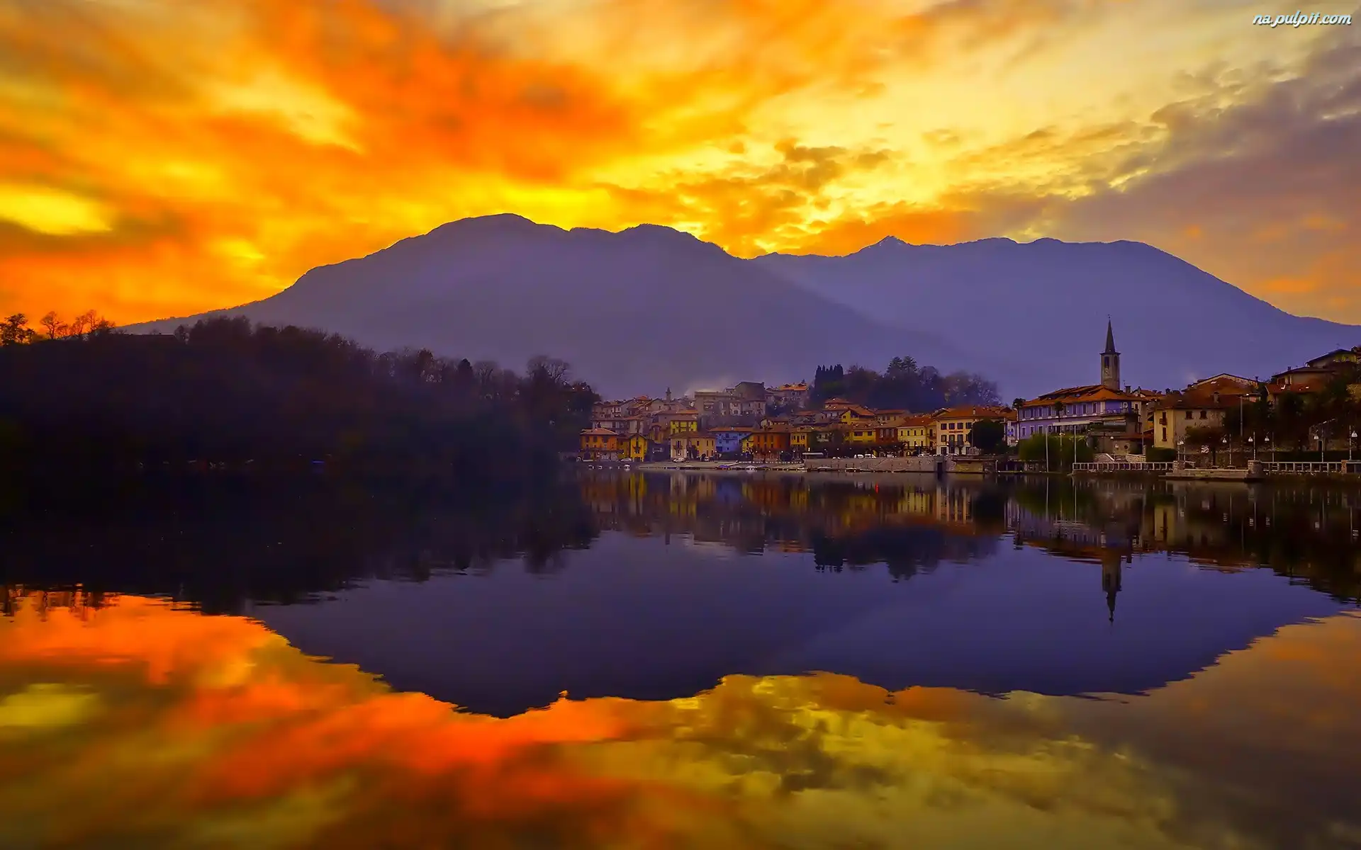 Odbicie, Miasto, Góry, Piękny, W, Wodzie, Zachód, Jezioro, Słońca Na Pulpit