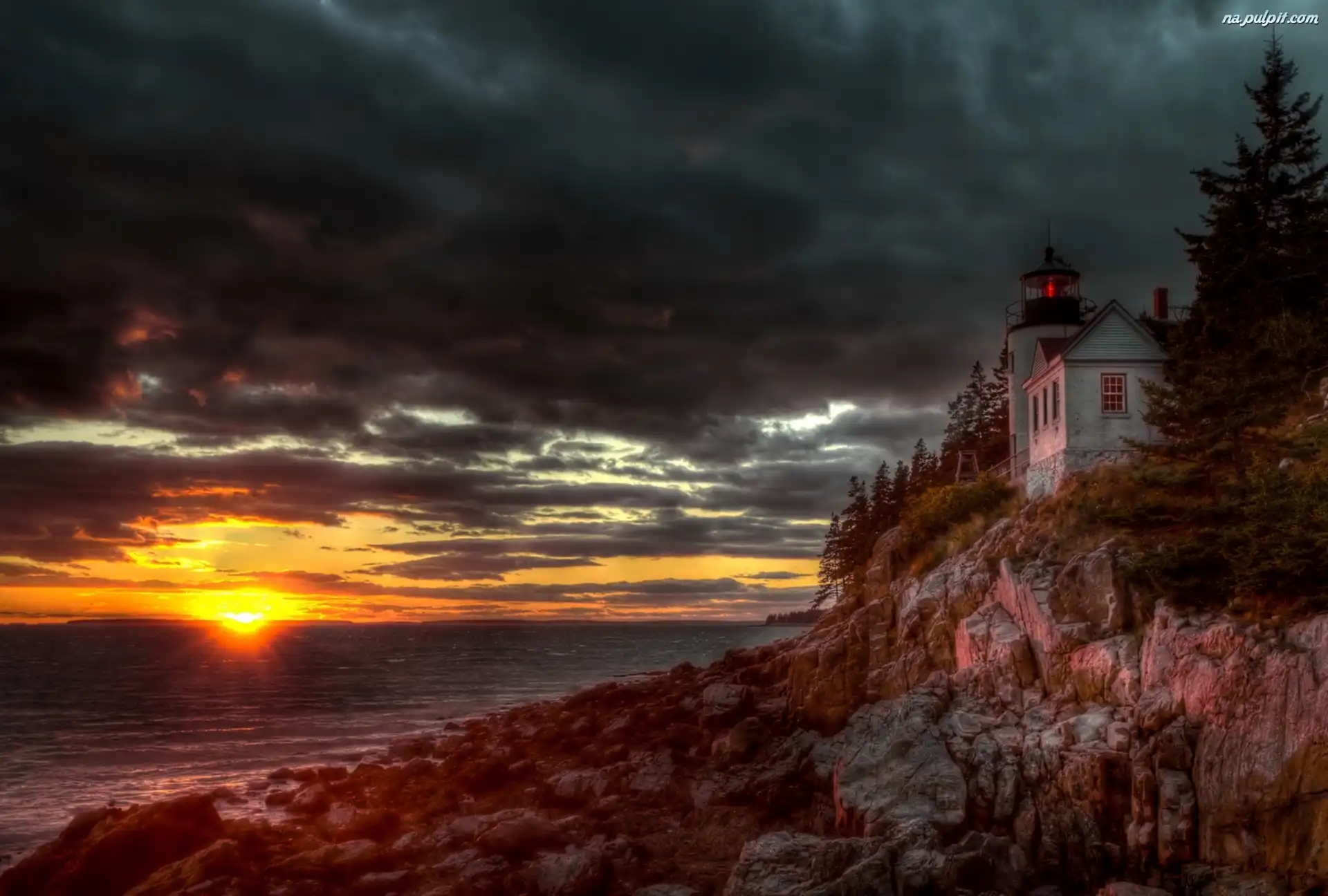 Morze, Bass Harbor, Maine, Chmury, Latarnia Morska, Zachód Słońca Na Pulpit