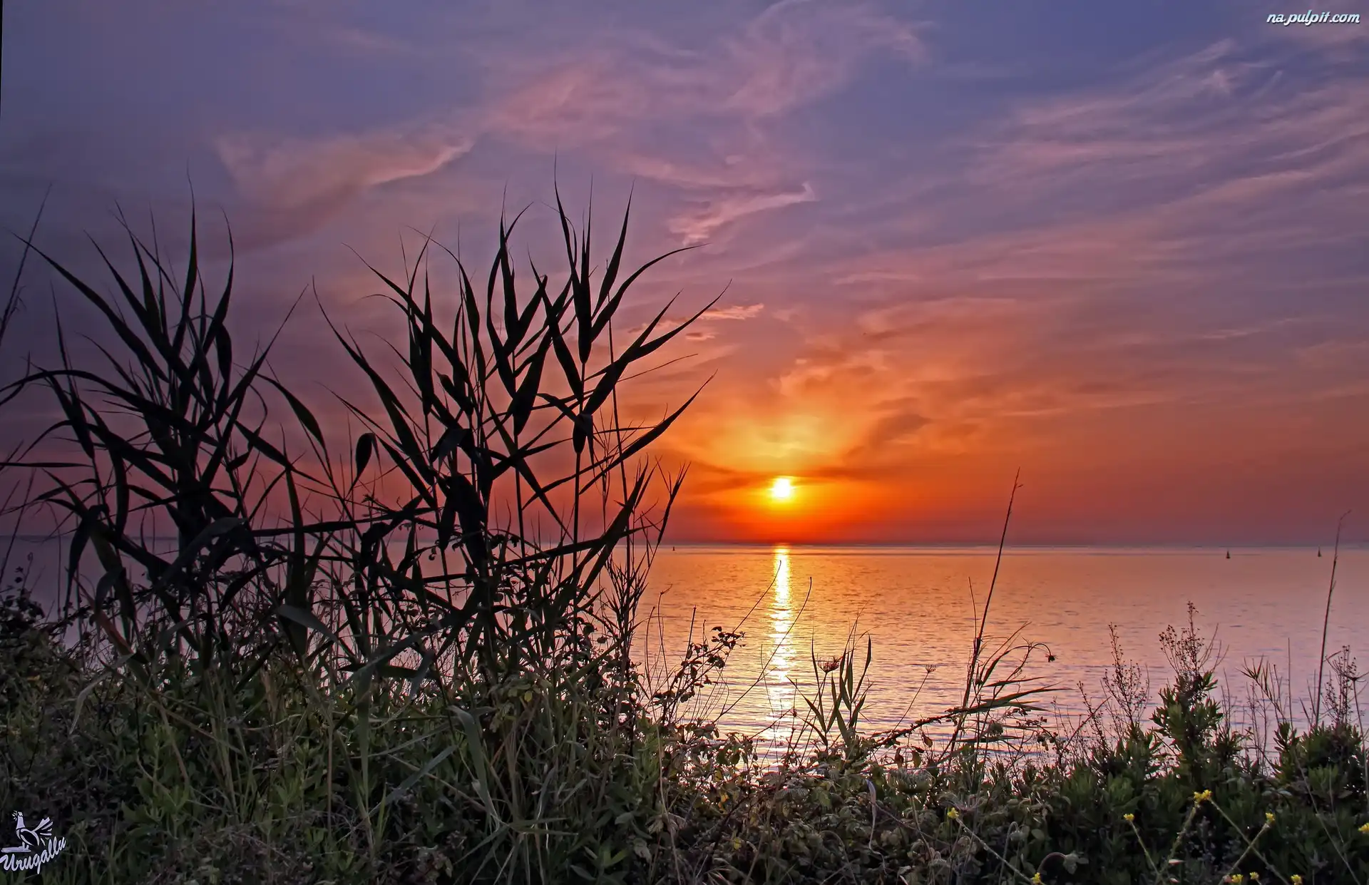 Słońca, Trawy, Żaglówki, Jezioro, Zachód