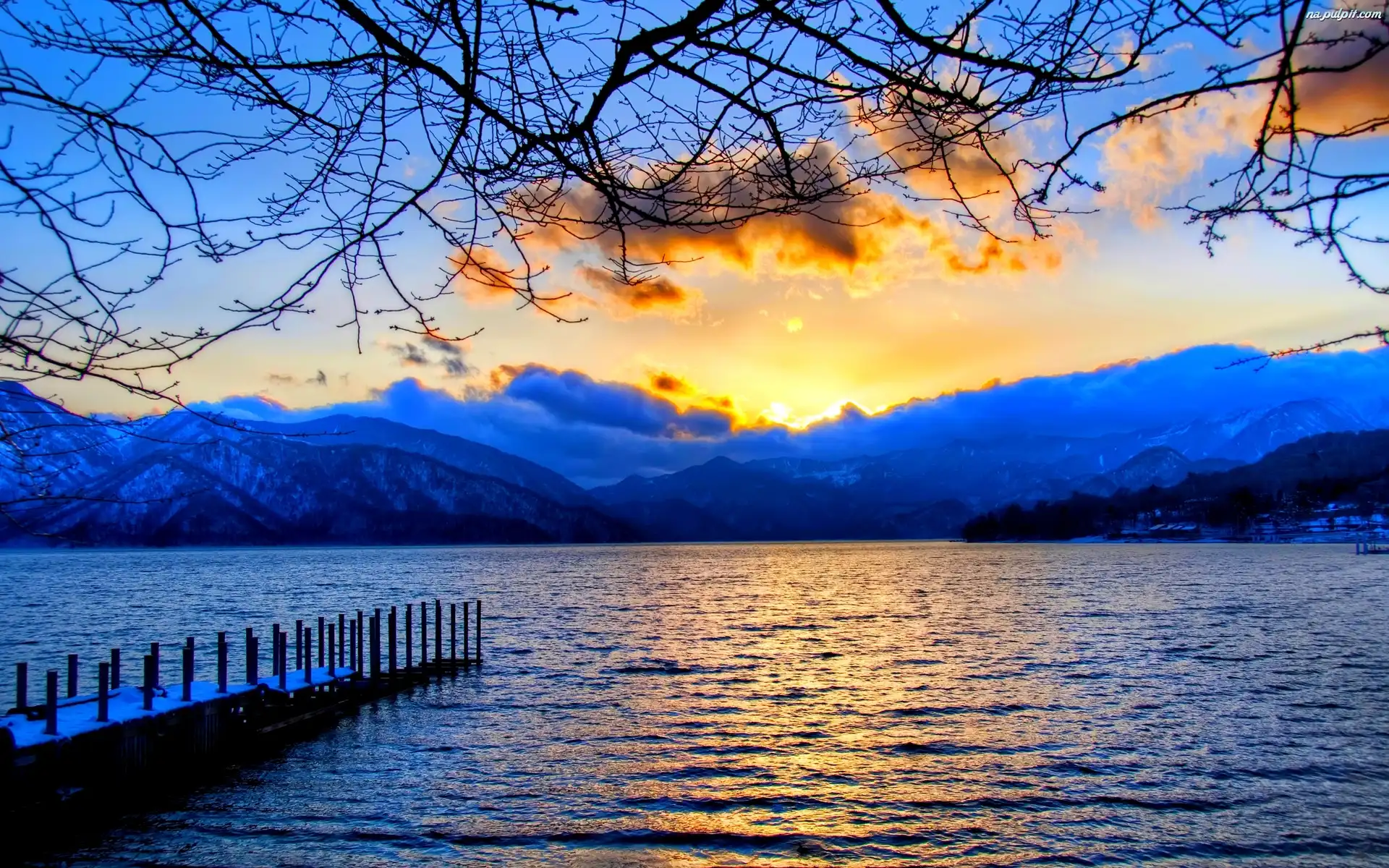 Słońca, Pomost, Brzeg, Jezioro, Zachód