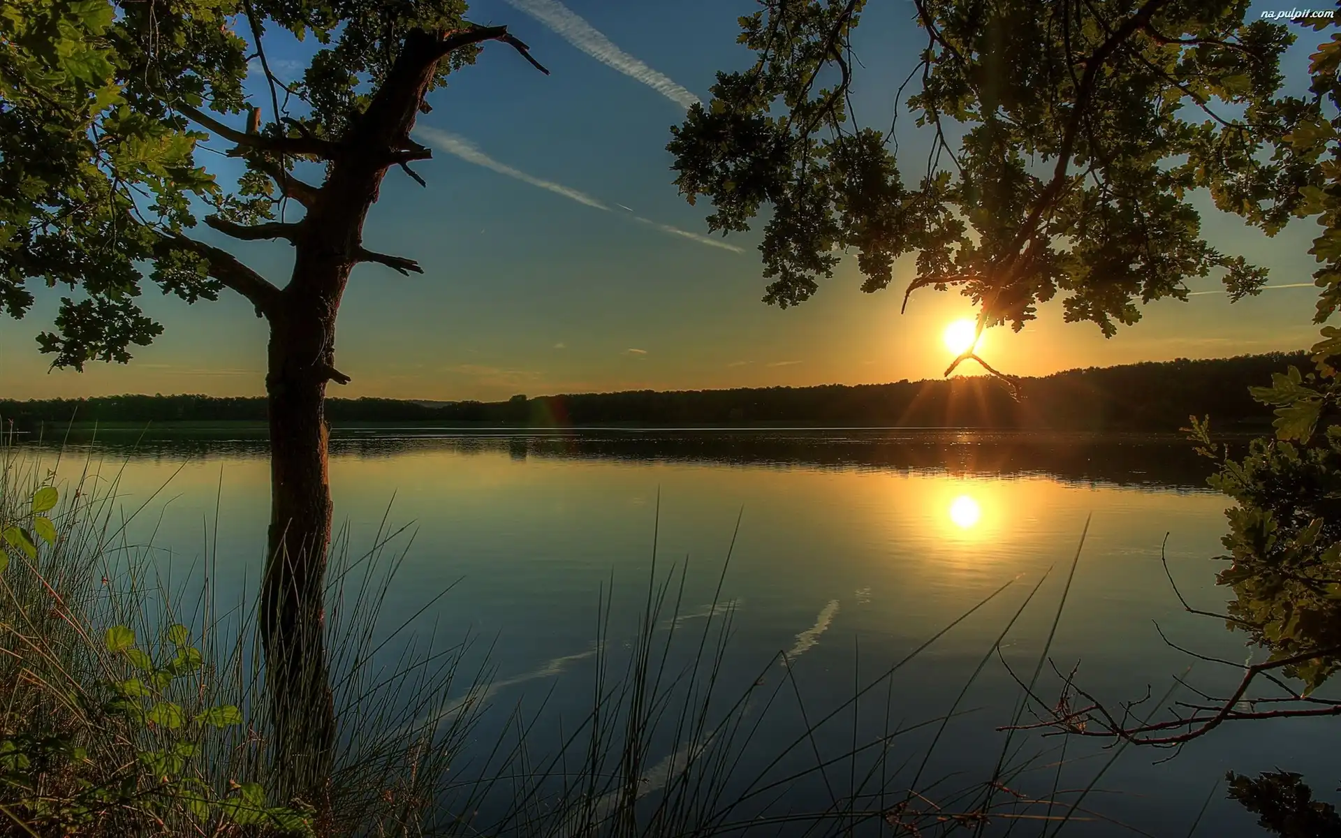 Słońca, Lasy, Drzewa, Jezioro, Wschód