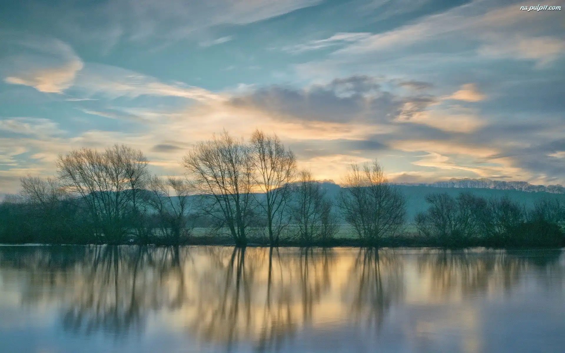 Słońca, Wzgórza, Drzewa, Jezioro, Zachód
