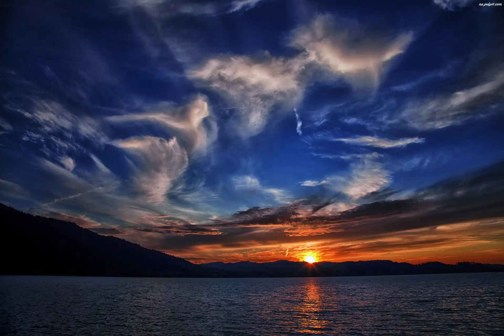 Słońca, Chmury, Niebo, Jezioro, Zachód