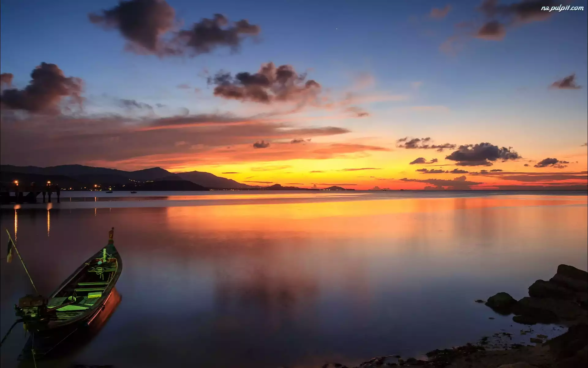 Słońca, Łódka, Jezioro, Zachód